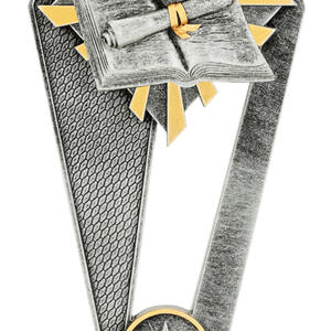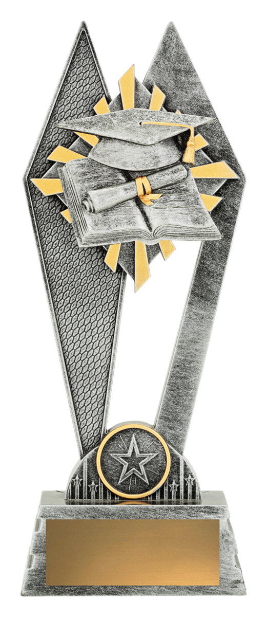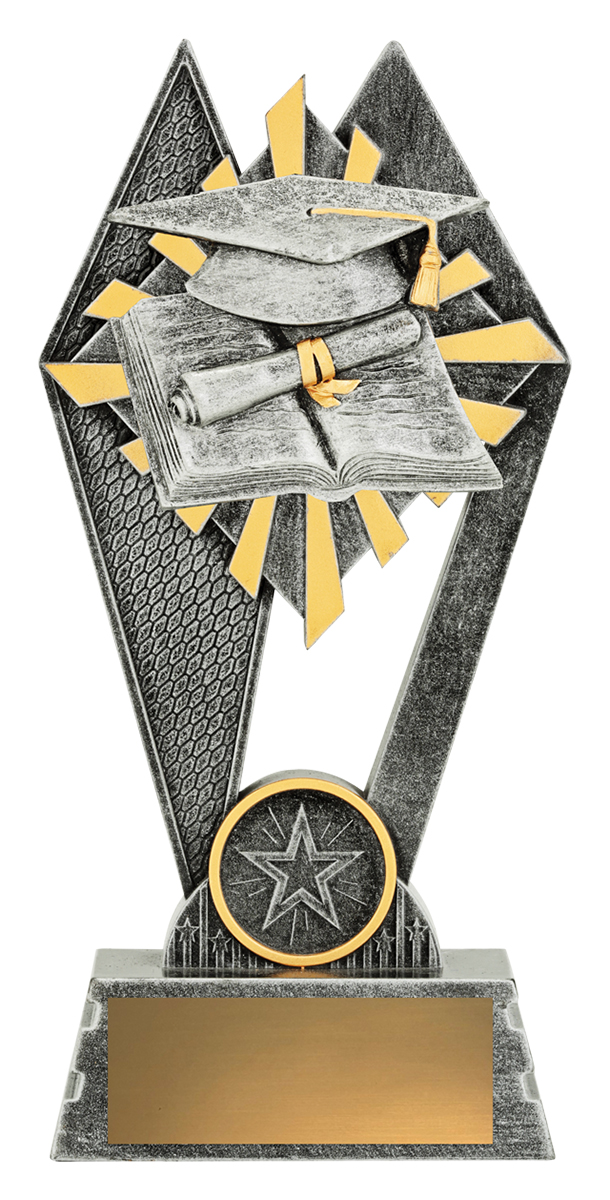 Celebrate excellence with this distinguished academic achievement trophy. Crafted in silver and gold, it features a graduation cap, diploma, and book design, complemented by a star emblem at its sturdy triangular base. Elegant resin elements combine to create a memorable award, perfect for recognising outstanding academic accomplishment.