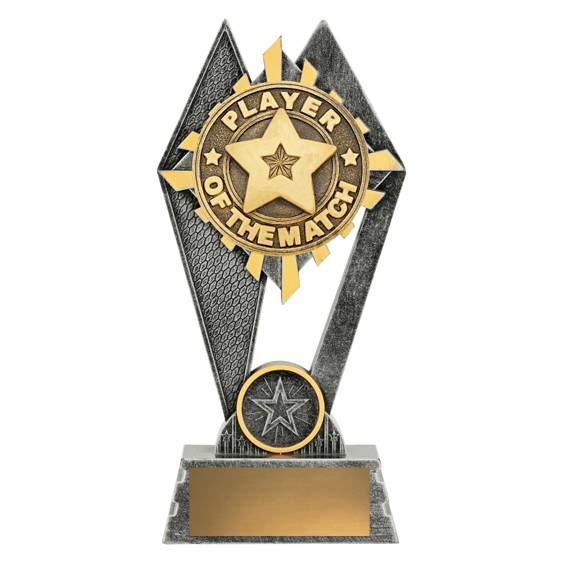 Celebrate outstanding performance with this player of the match trophy, crafted for versatility across any sporting discipline. Featuring geometric and circular elements in gold and silver tones, its striking resin construction is complemented by bold star motifs. Purposeful, durable, and visually striking, it offers a memorable way to recognise individual excellence in general sports.