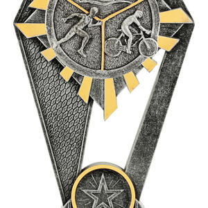 Crafted with precision for the triathlon community, this triathlon trophy stands out with its dynamic triangular and circular design. Finished in contrasting silver and gold, it features detailed icons for swimming, cycling, and running, capturing the essence of multisport achievement. Durable resin construction ensures a quality, memorable award for any triathlon event.