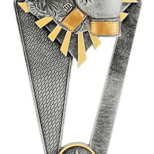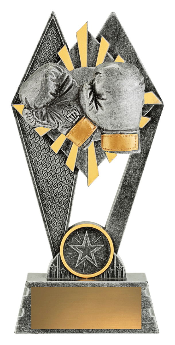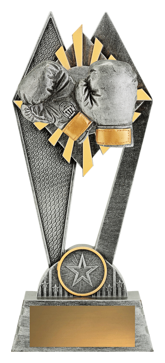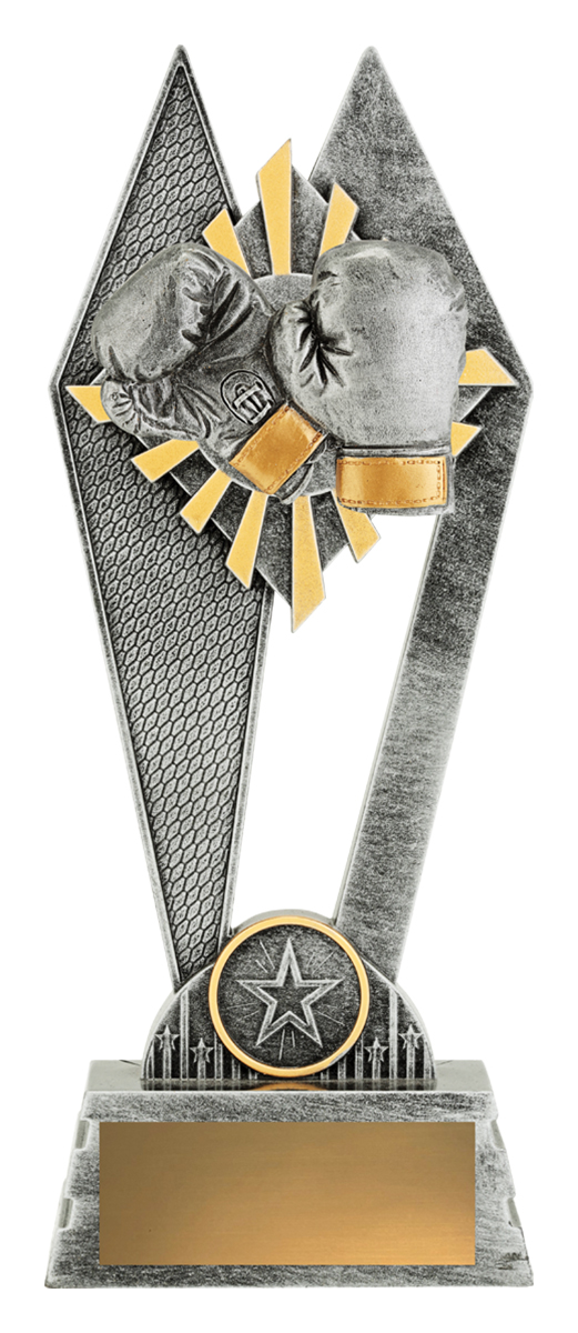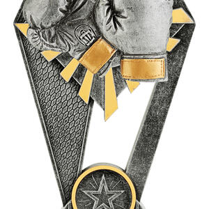 Crafted with precision and durability, this boxing trophy features a striking silver finish accented with gold highlights and a distinctive star emblem. The bold boxing gloves design sits atop a strudy base, creating a memorable symbol of achievement. Perfect for recognising dedication and skill in boxing, it offers a professional and celebratory presentation for any event.