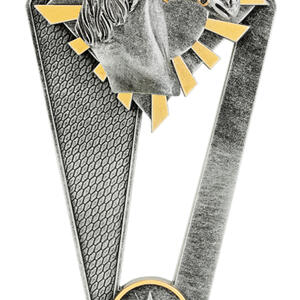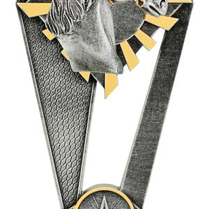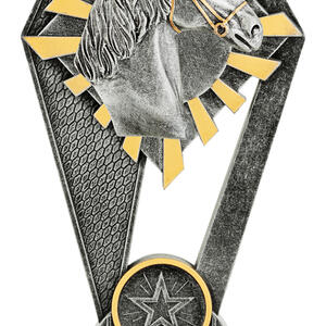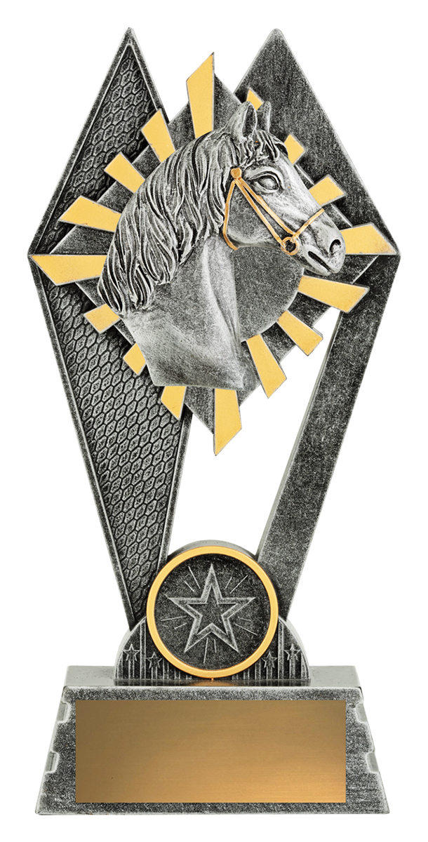 This tall resin trophy features a prominent horse head sculpture rising from an angular diamond shaped backdrop with gold sun-ray accents. The lower star medallion and structured base provide a strong presentation suitable for champion riders, high point awards and competitive equestrian events.