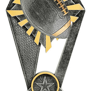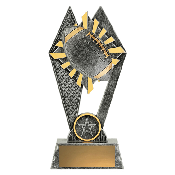 This american football trophy features a dynamic football design accented by a shining star emblem, symbolising standout achievement on the field. Crafted from durable resin in a sophisticated silver and gold finish, it offers a refined presentation. The sturdy base is designed for additional customisation, making it a memorable award for clubs, schools, and sporting events.