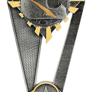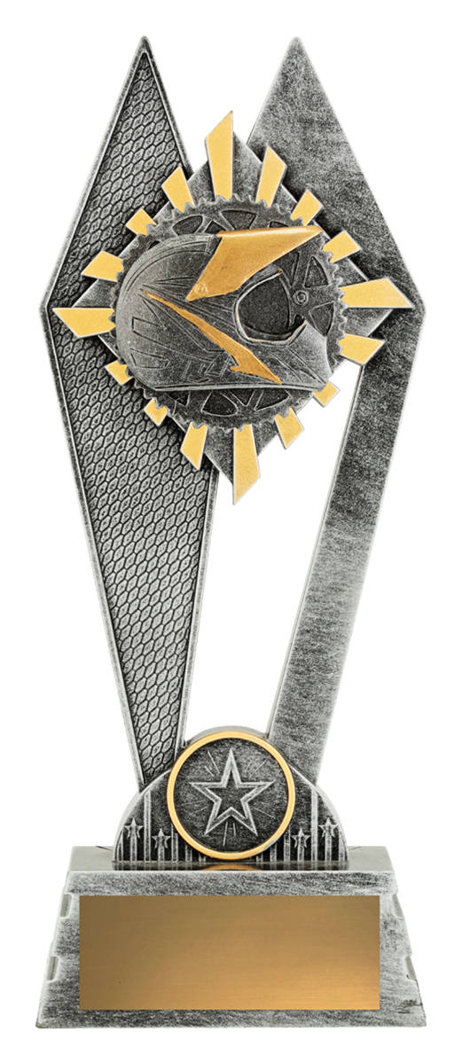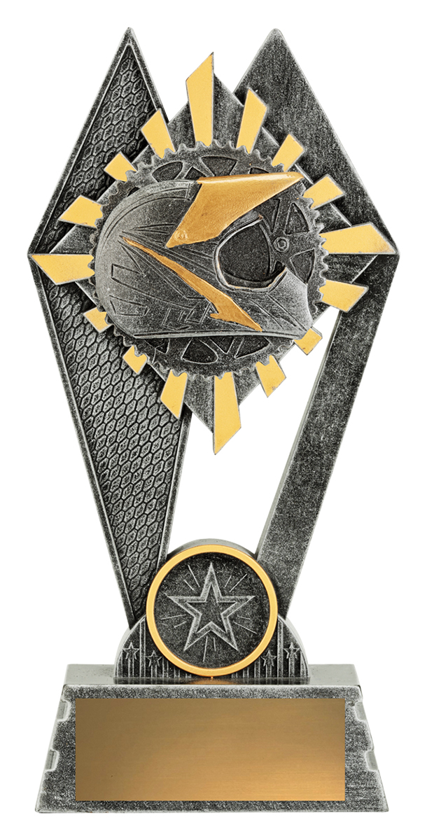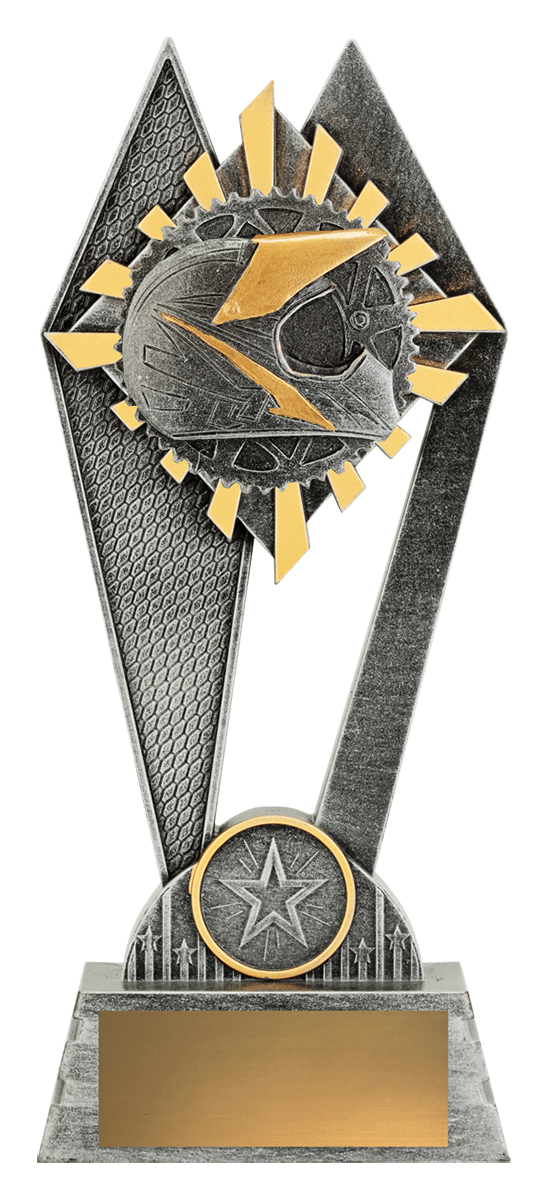 Crafted with precision, this motorcross trophy features a dynamic blend of angular and circular forms, highlighted by a detailed helmet design and star emblem. The sophisticated silver and gold finish creates a memorable impression for motorsport recognition. Crafted from a durable resin construction, make it an elegant choice for celebrating achievement in any motorcross event.