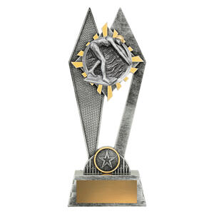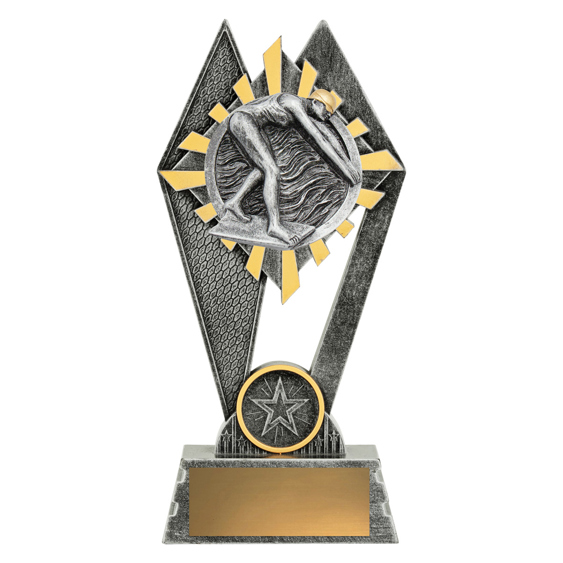 Celebrate athletic achievement with this female swim trophy, featuring a striking geometric design in silver and gold. Crafted from durable resin, it showcases a dynamic runner figure poised for victory, complemented by a star emblem, making it an elegant and memorable choice for recognising excellence in sport.