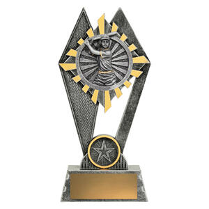 This elegant trophy honours achievement in softball, with a confident female batter figure poised in action. Finished in sophisticated silver and gold, its geometric silhouette and circular centrepiece create a modern, standout look. A star emblem at the base and quality resin construction make it a distinguished choice among softball trophies.