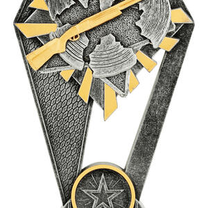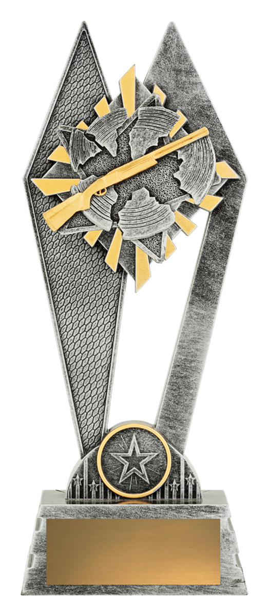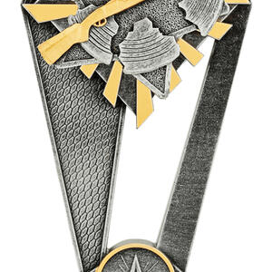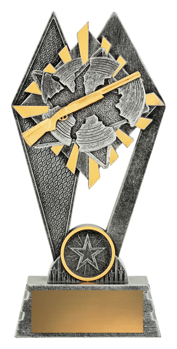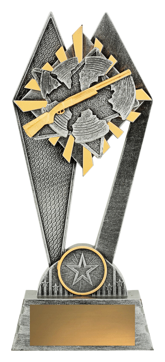 Crafted for distinction, this clay pigeon trophy features a striking blend of silver and gold tones, highlighting its elegant angular and circular form. The dynamic shotgun and shattered clay target design captures the essence of shooting sports, making it an exclusive choice for recognising precision and achievement at competitions and club events. Durable resin construction ensures a lasting, memorable award.
