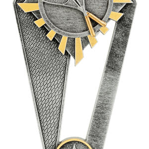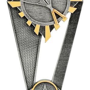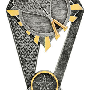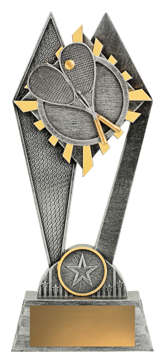 This squash trophy features a striking triangular base with two upward arms, crafted from durable resin in elegant silver and gold tones. Two racquets and a ball are prominently displayed, capturing the dynamic spirit of the sport. A star emblem at the base completes this unique award, making it a fitting choice for celebrating squash achievement.