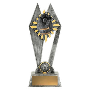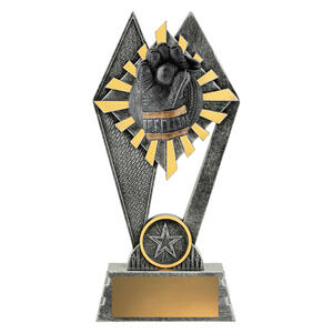 Distinctively designed in silver and gold, this cricket trophy combines angular lines and circular forms for a memorable, modern silhouette. The addition of a star emblem and a raised fist motif celebrates outstanding performance and team spirit. Crafted from durable resin, it is a trusted choice for commemorating achievement in cricket with an elegant and contemporary touch.