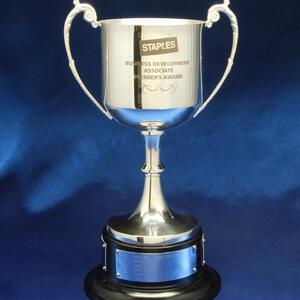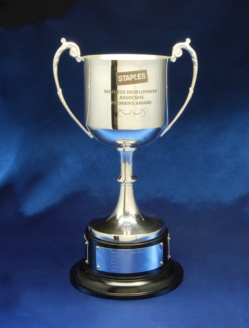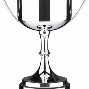 This silver trophy cup showcases refined craftsmanship with its polished metal finish, broad dual handles, and elegant black base accented by a silver collar. Available in multiple sizes, it is anchored by a small pedestal and includes a silver engraving plate for personalised recognition.