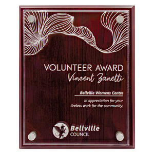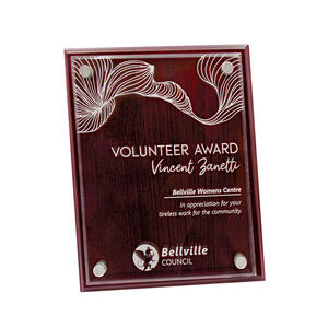 This award plaque combines a foil-rosewood finish with a floating acrylic front for a value-priced choice.