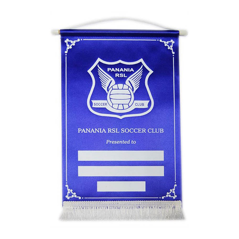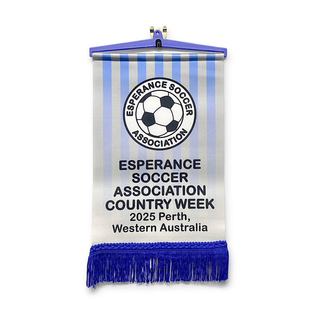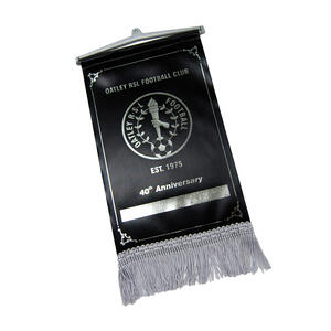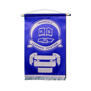 This bannerette with plastic hanger and fringe delivers a refined recognition solution for events, achievements, or team celebrations. Crafted for custom printed banners in vivid full colour, it offers a professional canvas for logos, awards, or commemorative designs. The durable hanger and elegant fringe ensure your message stands out with clarity and significance in any setting.