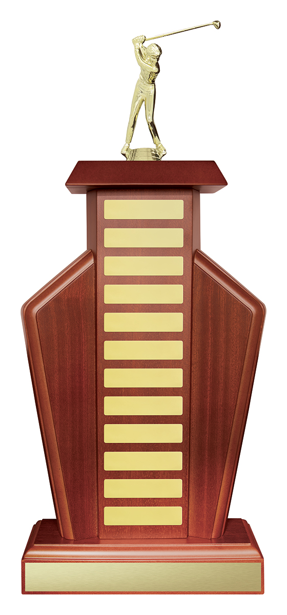 This sports trophy perpetual honours golf achievement with timeless style. Crafted from rich brown wood and finished with gold coloured metal accents, it features a striking rectangular shape with a gentle taper. The interchangeable gold plastic figurine atop and multiple gold plates create an elegant, durable centrepiece for recognising ongoing excellence in any golf event.