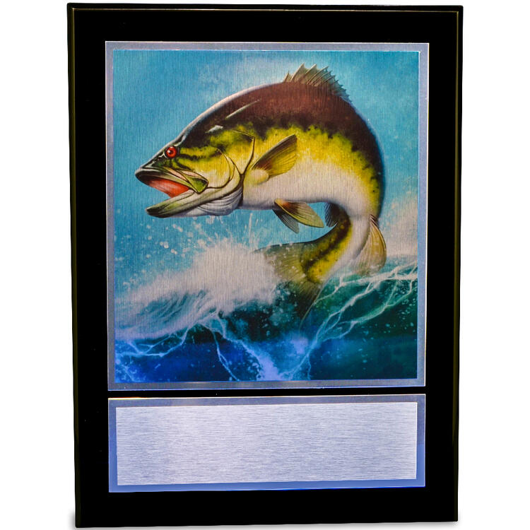 This vibrant Bass Fishing Plaque features a dynamic full colour image printed on brushed metal, capturing the energy of a bass leaping from the water. Mounted on a black timber backing with a brushed silver engraving plate, its an eye catching and durable award ideal for fishing clubs, tournaments, or personal recognition.