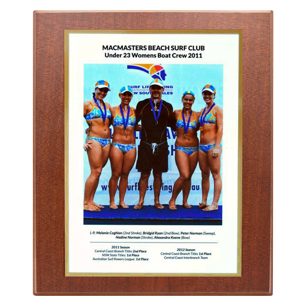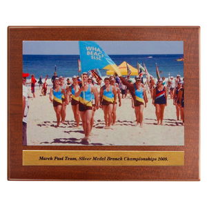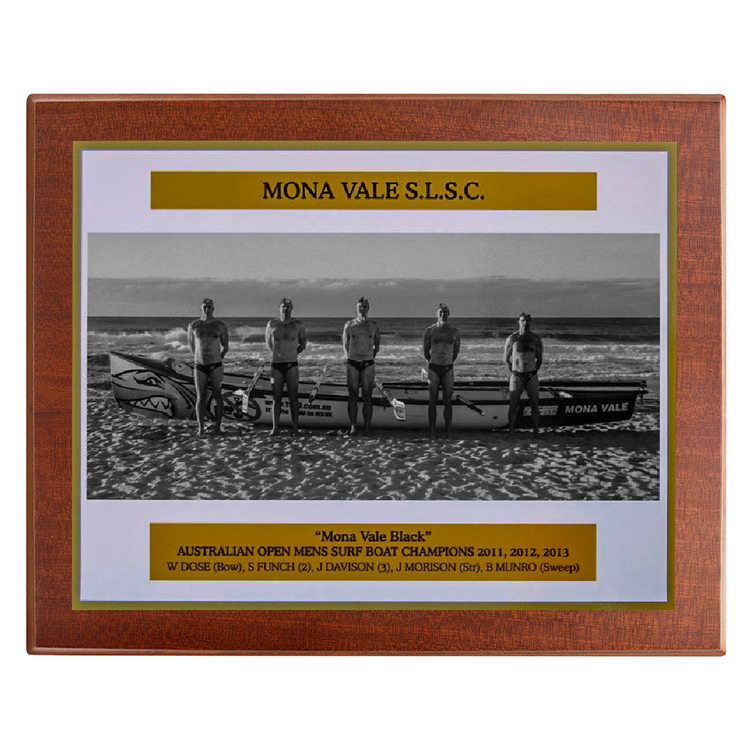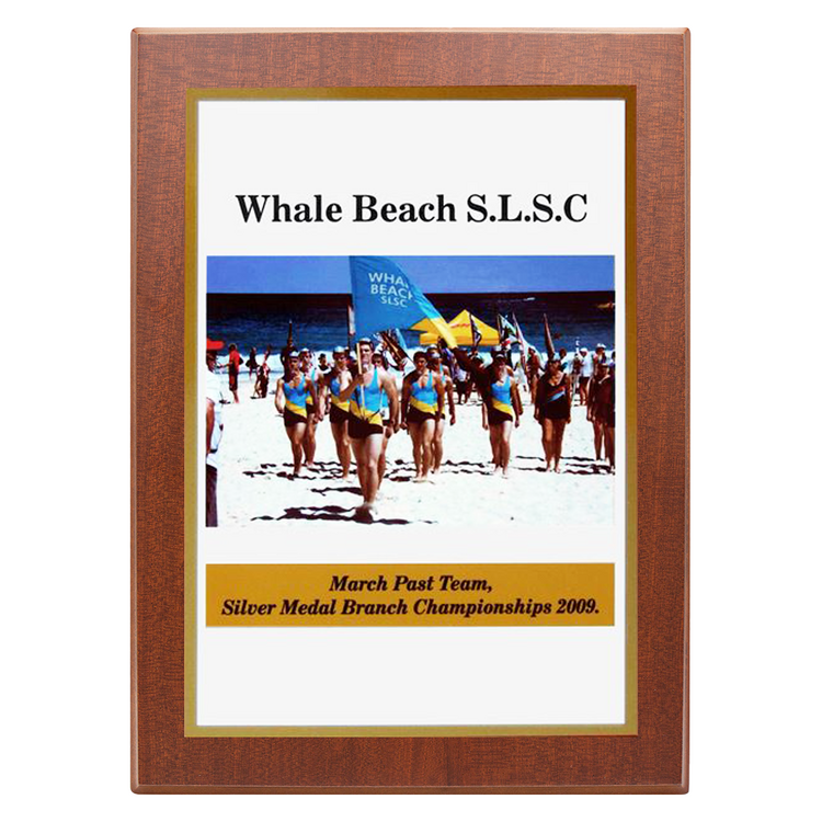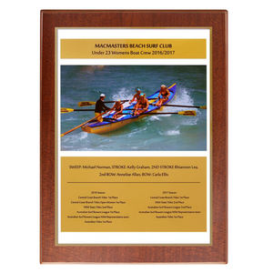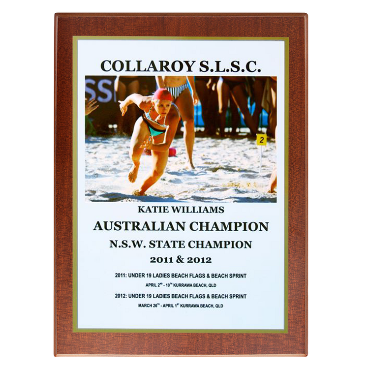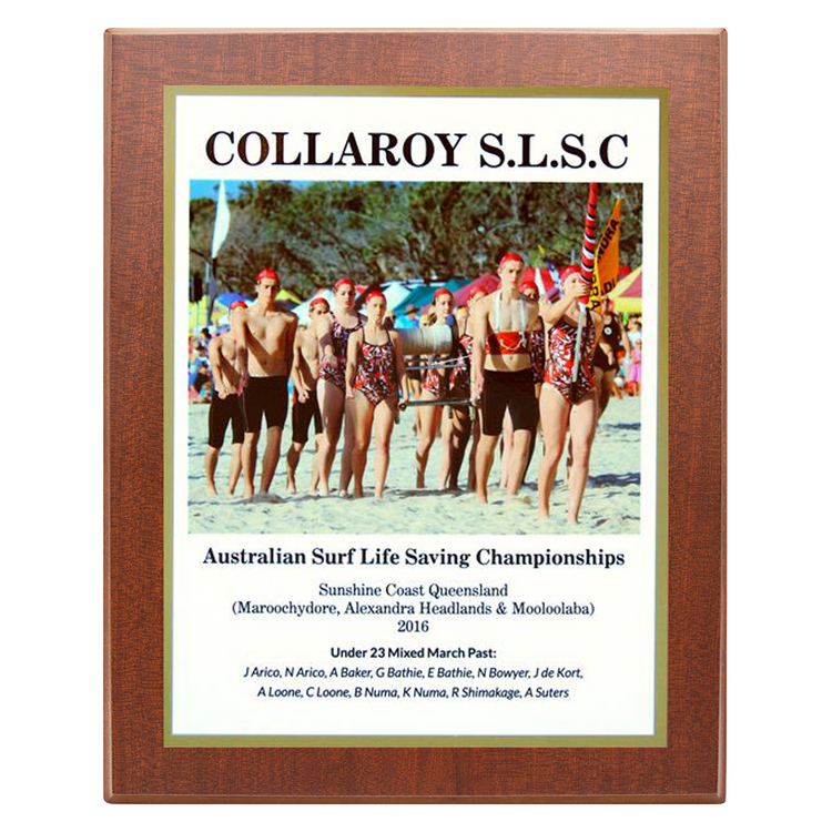 This Metal 2 Layer Perma Plaque Style Plaque features a full colour sublimation print mounted onto a mirror gold metal backing, creating a striking reflective border around your design. The metal plate is secured to a richly finished timber plaque, offering a professional and durable presentation for awards, commemorations, or photo displays. Perfect for sporting clubs, corporate recognition, and event displays, this style provides a modern yet timeless look with long lasting print quality.
