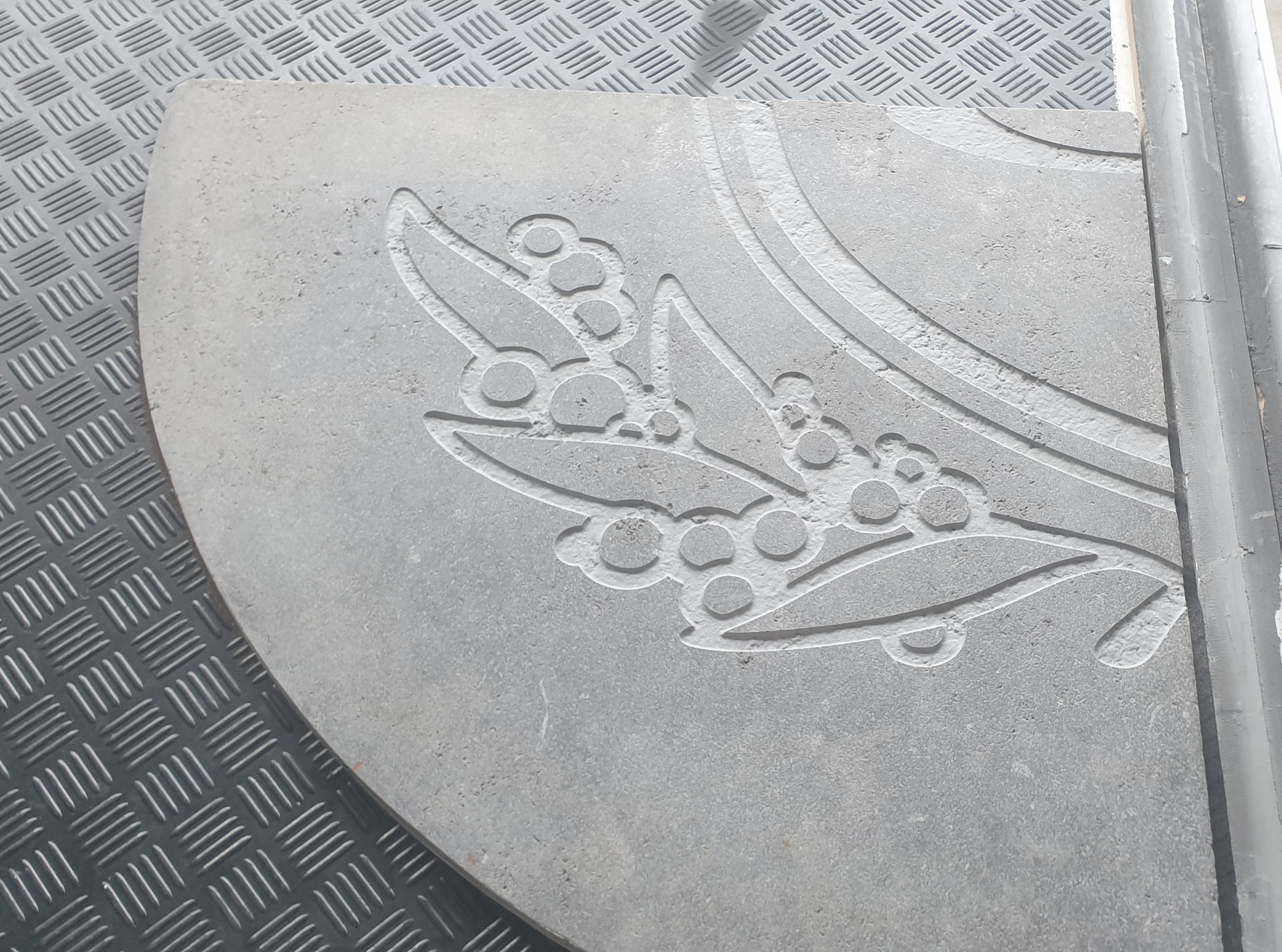 The brass detailing was precision laser-cut to match the engraved pattern exactly, ensuring each element aligned seamlessly during installation. When assembled, the four engraved stone sections and brass components came together with absolute accuracy — fitting “like a glove” to form a refined, durable feature that captures both craftsmanship and modern precision engineering.