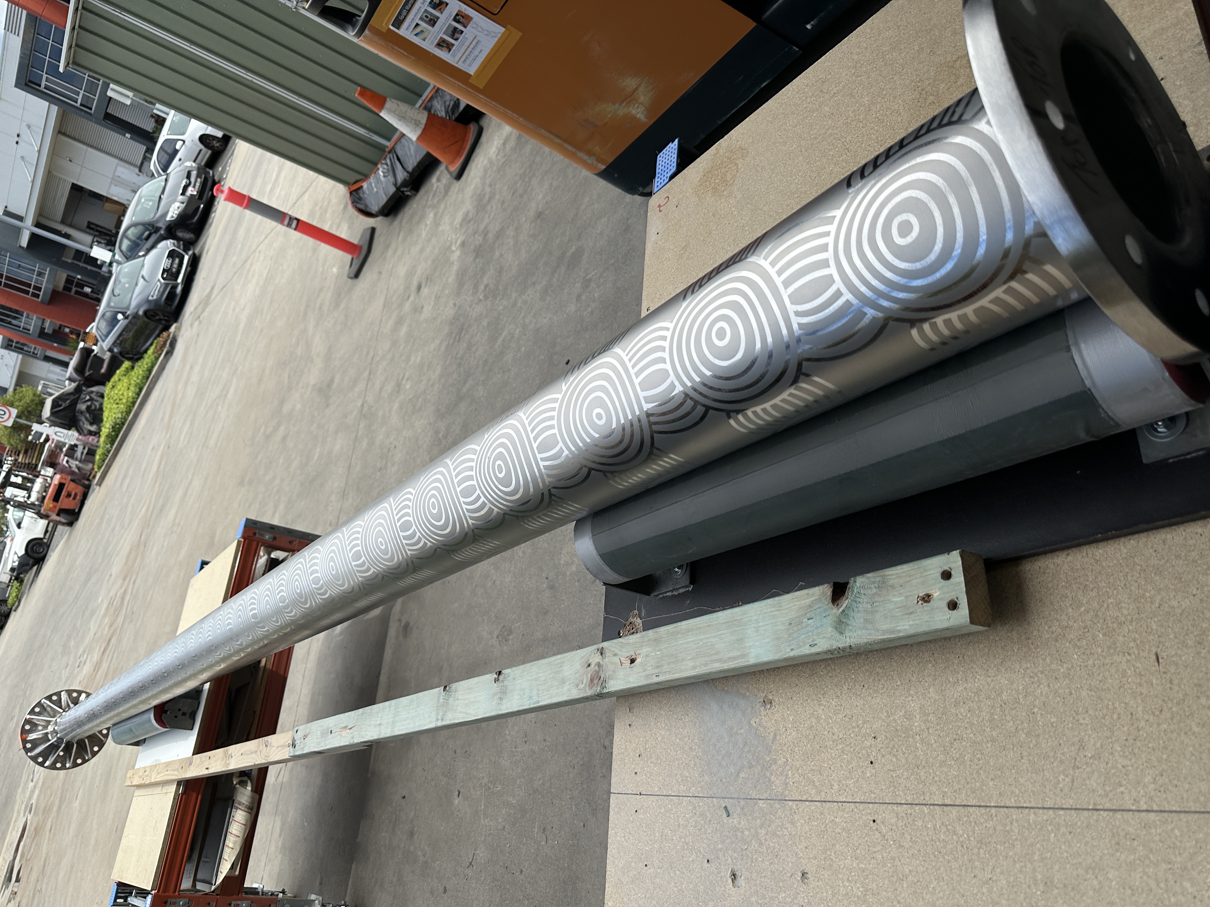 Once the extensive vinyl masking was produced and applied, the real test began. Wrapping the curved shaft required patience and experience to align perfectly. Our Master Blaster, Ghiath Khalil, meticulously masked all five sides of the 2-metre square box and fully wrapped the shaft in vinyl before expertly sandblasting the entire surface to achieve the precise finish that brought the artwork to life.