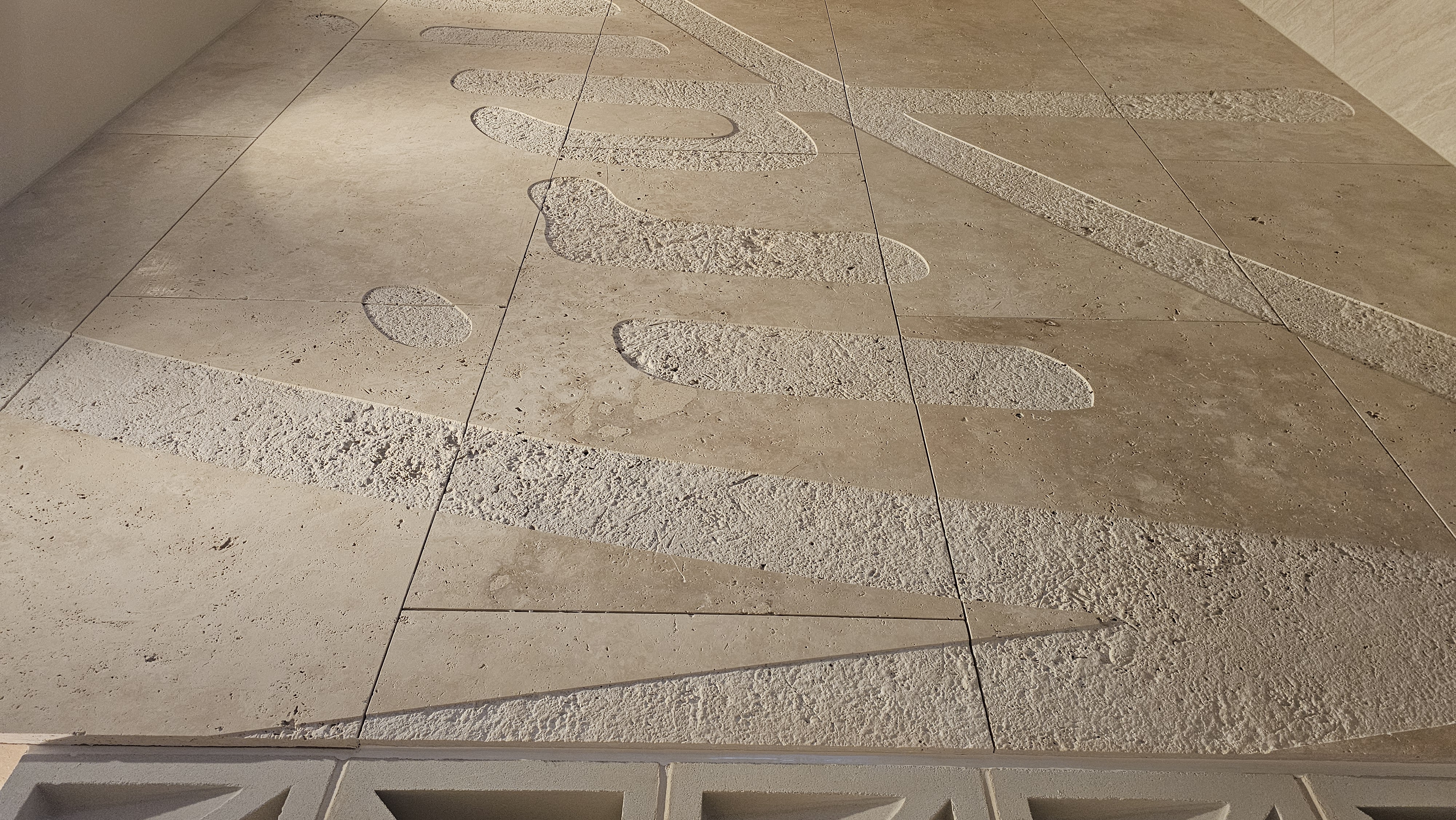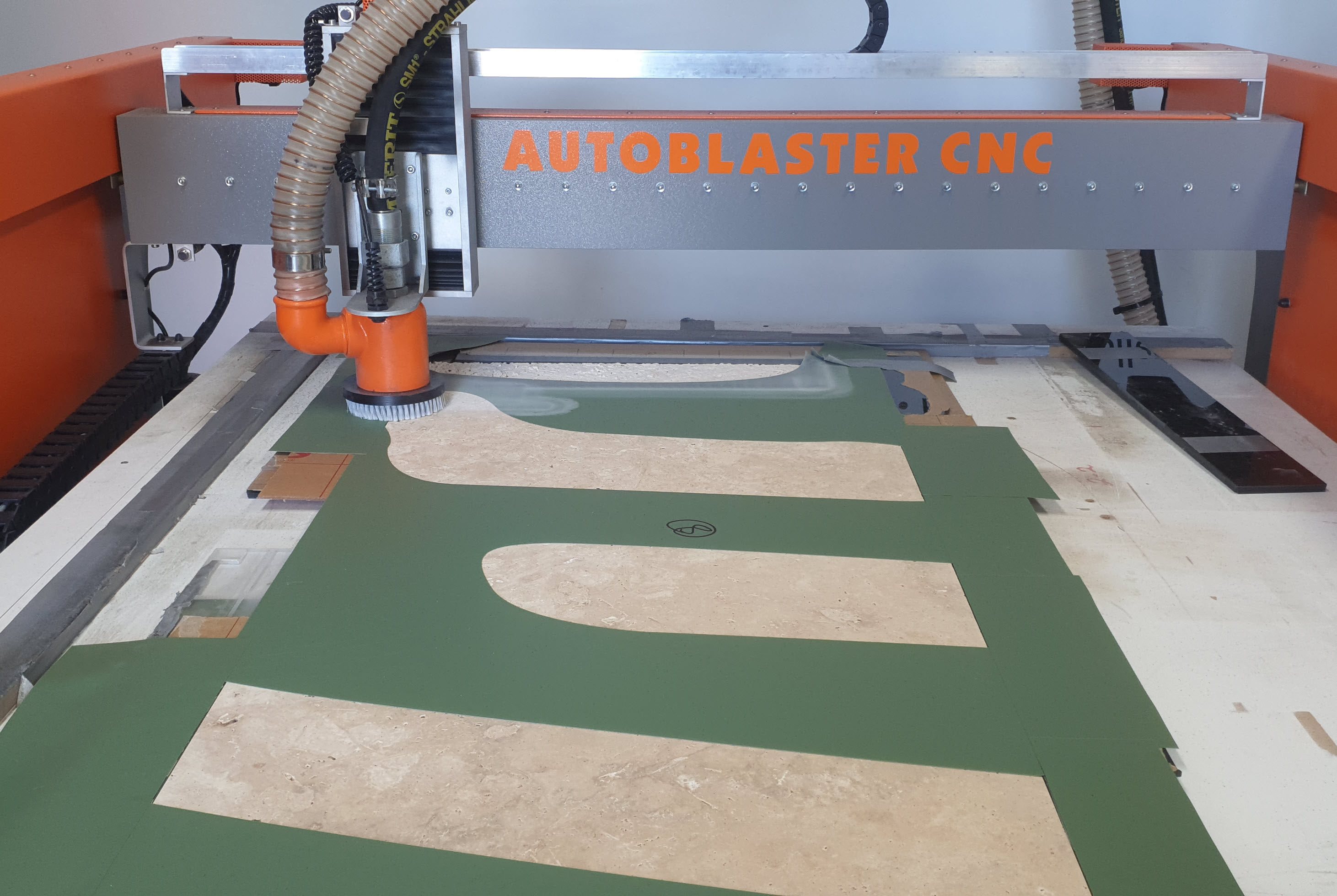 After thorough checks, the masked tiles were transferred to the CNC AutoBlaster. The system was programmed to map the engraving zones for an efficient and accurate blast sequence. With a fresh bag of abrasive, the AutoBlaster was calibrated for depth and run speed before working progressively across all 14 Travertine tiles, ensuring a consistent finish throughout the entire montage.