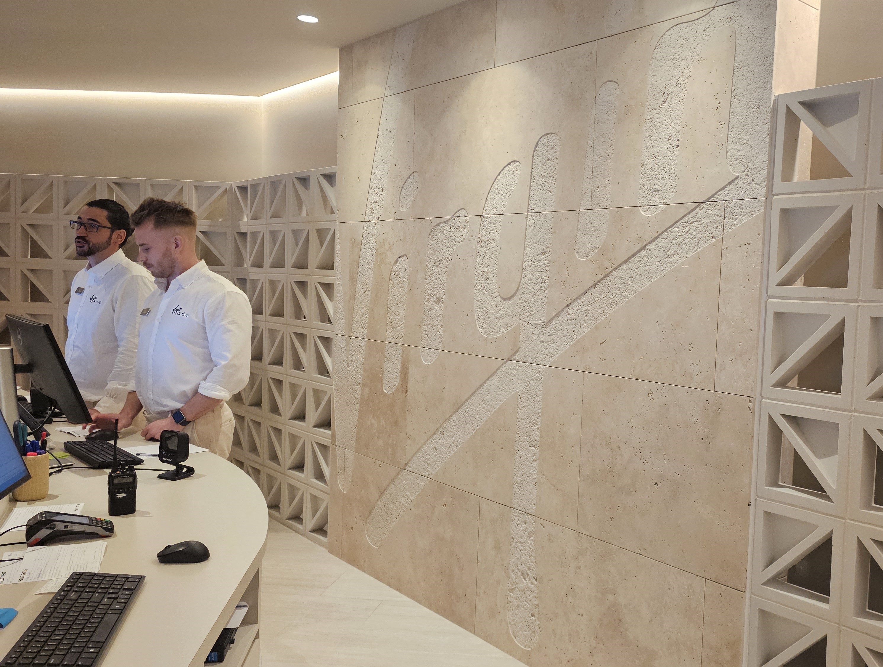 Virgin Active’s new flagship facility in Bondi Junction features a striking reception wall that showcases the iconic Virgin logo etched into natural Travertine stone. Each paver measured 1200×600×1mm, with the full wall spanning 2700 x2700mm.