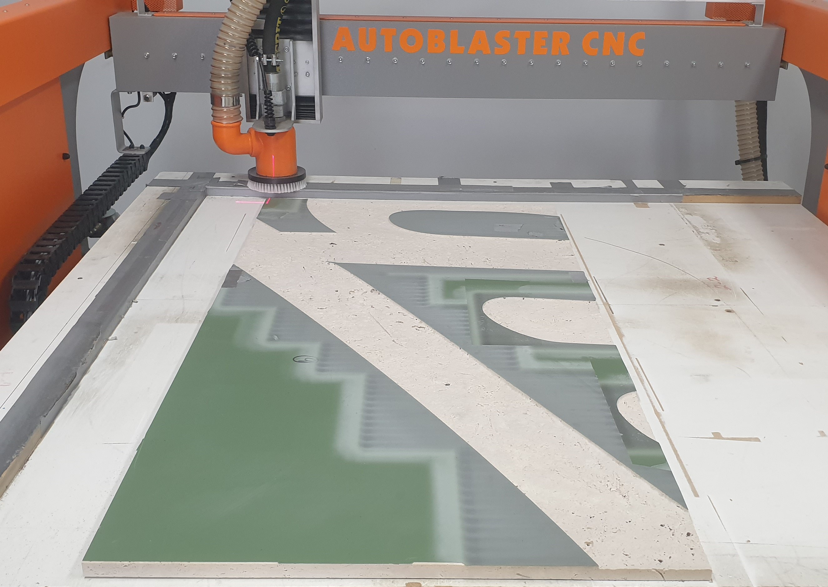 Using our CNC AutoBlaster, we achieved consistent depth and finish across every panel, ensuring the design aligned seamlessly once installed by our client, TND Tiling. This technology allows us to deliver results far beyond manual methods, producing sharp, uniform engraving on every surface.