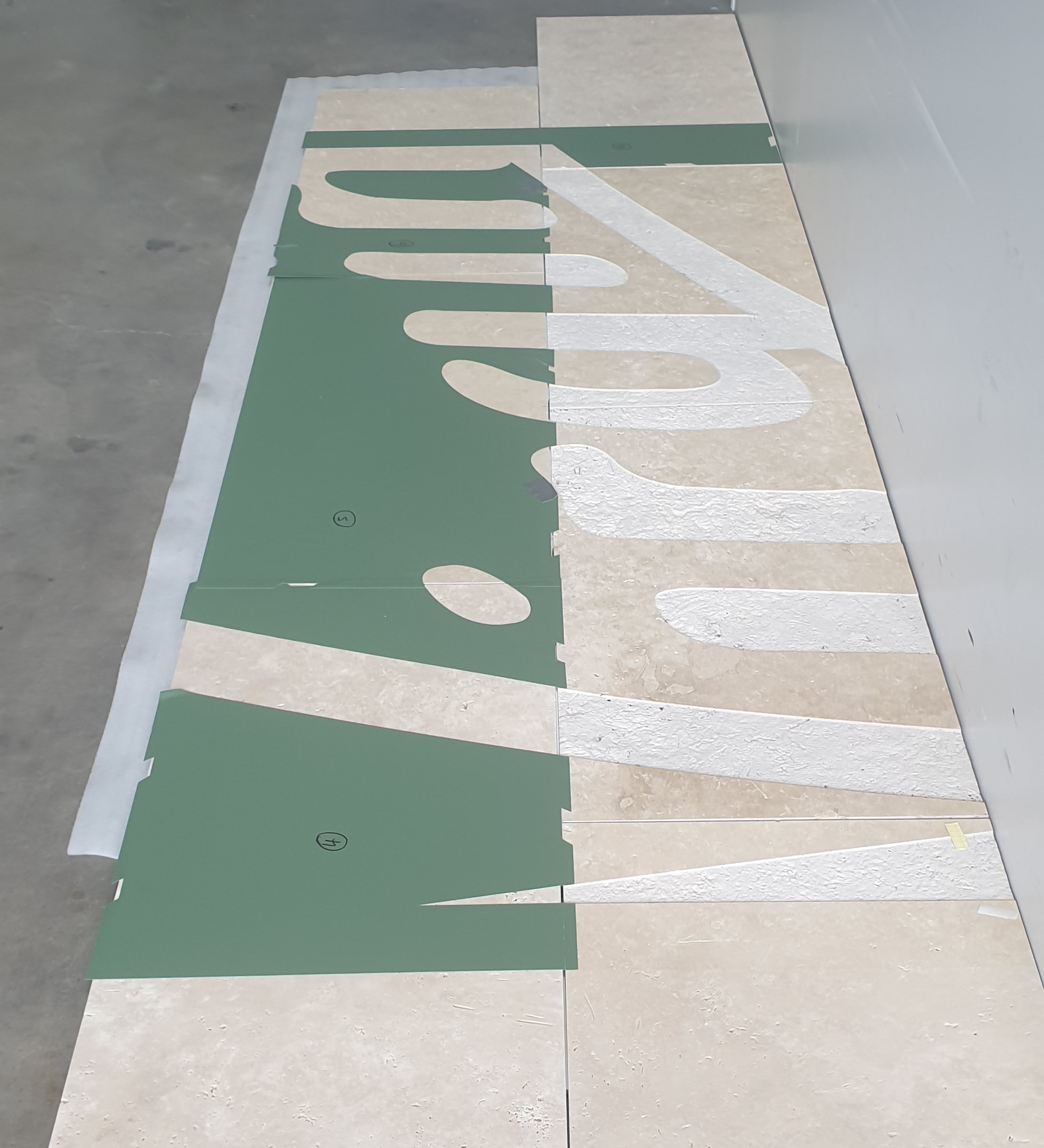 Production began by plotting the graphics to exact specifications and cutting a heavy-duty vinyl mask on our sign cutter, producing the design in sections. Our chief craftsman, Ghiath Khalil, then meticulously assembled the montage row by row, creating precisely masked 1200 × 600 mm tiles.
