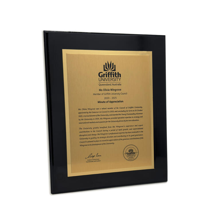 This gloss black timber plaque includes a full colour sublimation plate elevated with a mirror backing layer. The reflective base enhances colour vibrancy and adds depth, giving the award a more premium aesthetic. Ideal for high level corporate awards, sponsor recognition and standout achievements requiring a modern finish.