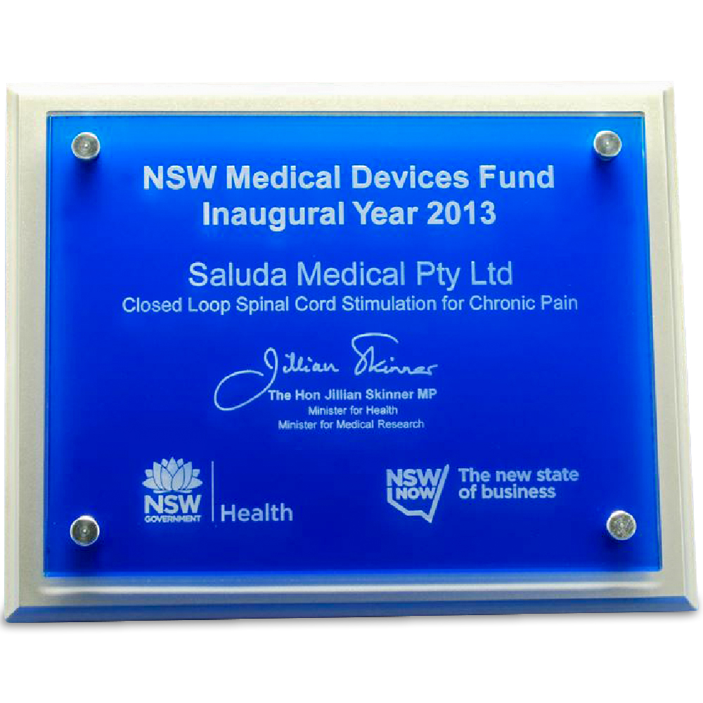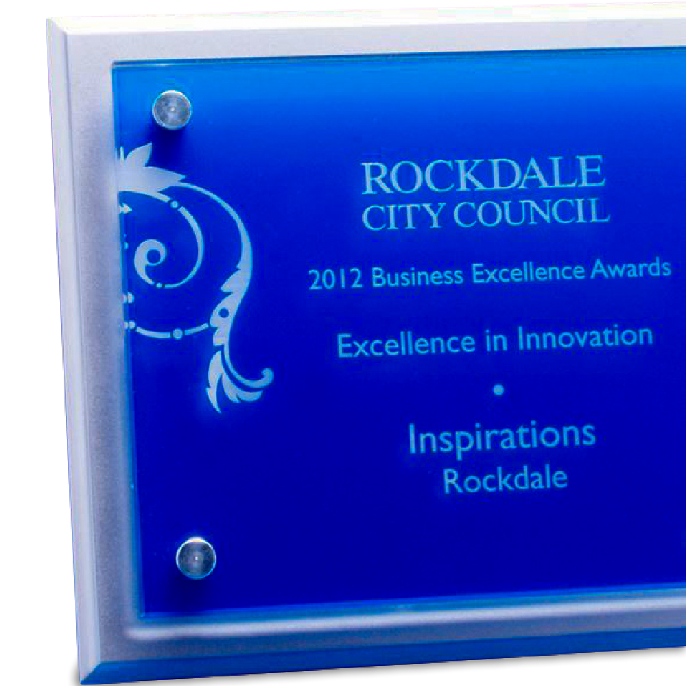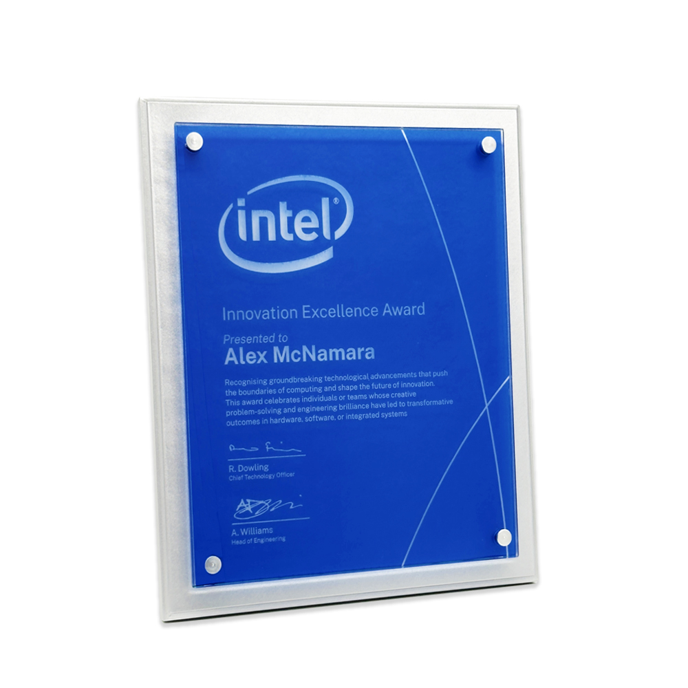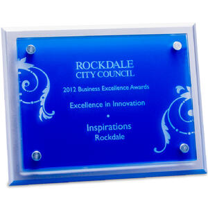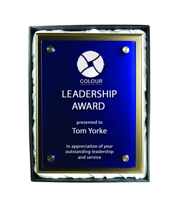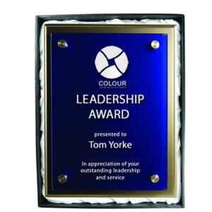 This premium gloss silver plaque features a blue glass front panel mounted with silver metal fittings to create a refined layered look. Presented in a satin lined gift box, this award is a modern, classy design.