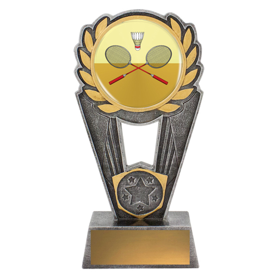A classic design featuring twin racquets and shuttlecock on a star framed backdrop, this resin badminton trophy celebrates dedication and skill. The gold highlights contrast beautifully against the antique silver finish, making it an enduring award for all levels of play.