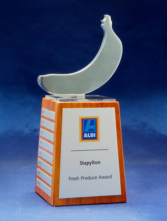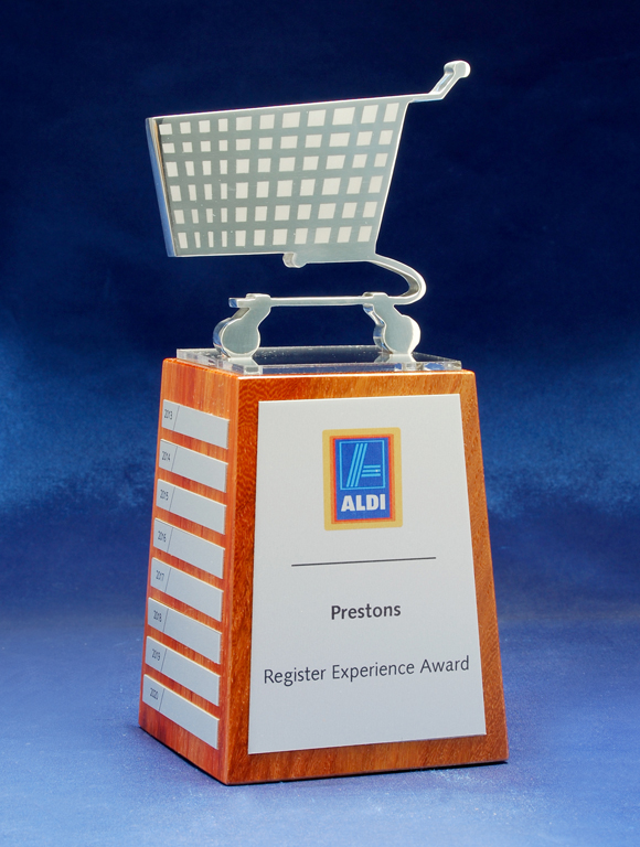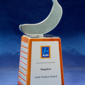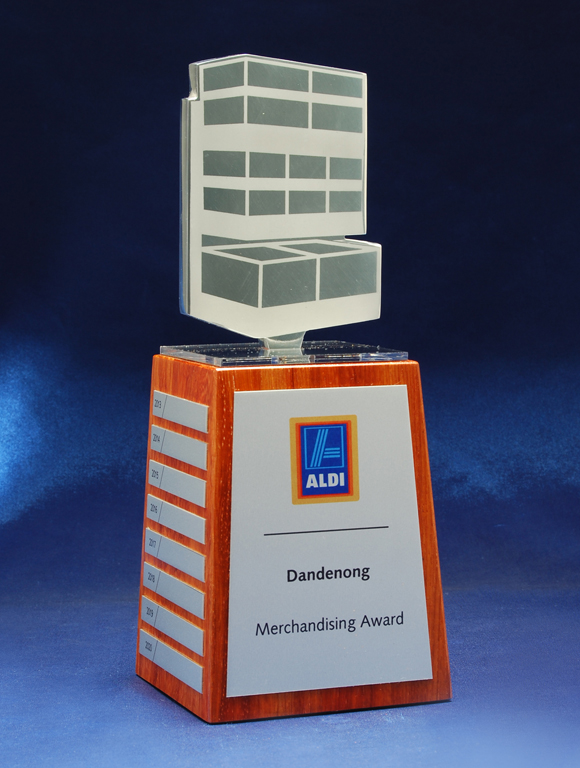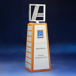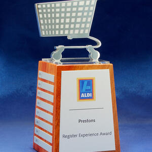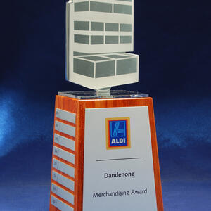 A modern custom perpetual trophy featuring a metal sculpted top mounted on a natural timber base. Designed with a brushed metal front panel and individual side plates for yearly or event based updates.