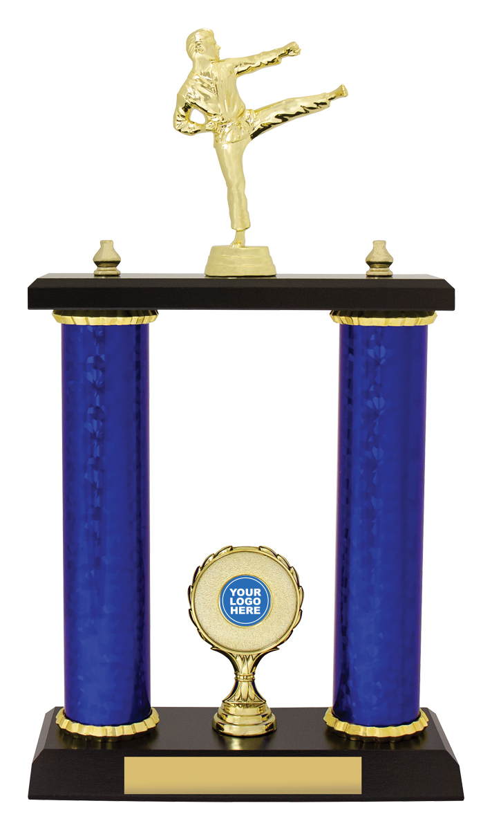 A striking karate trophy, this award captures the precision and energy of martial arts through a dynamic kicking figurine set atop a gold, blue, and black structure. The rectangular base and cylindrical columns provide a contemporary foundation, while the circular emblem area offers space for customisation. Crafted from quality plastic, it stands as a reliable and memorable mark of achievement.