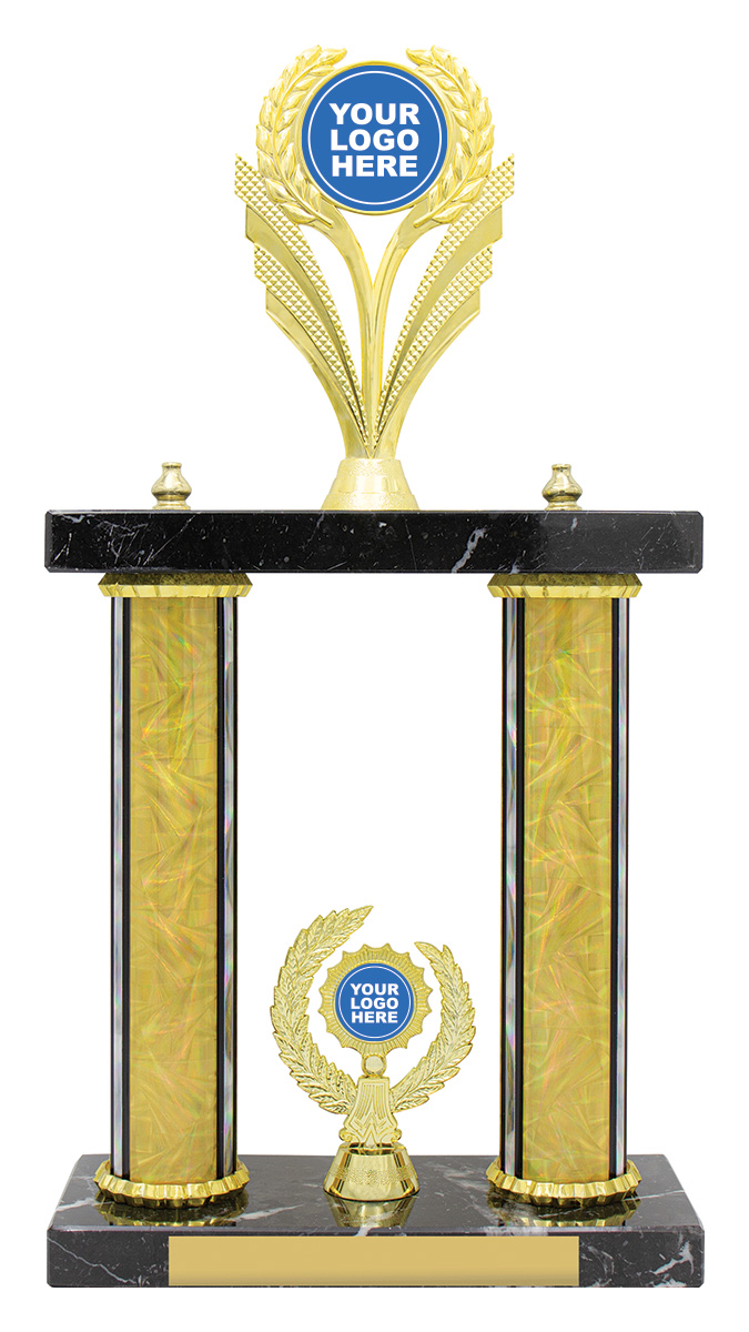 Crafted for versatility, this general sports trophy features a sturdy marble like base and vertical gold columns, accented with decorative laurel elements for a distinguished look. Its rectangular profile is highlighted by a customisable logo area and options for both 25mm and 50mm centrepieces. A reliable choice for recognising achievement across a range of sports trophies presentations.