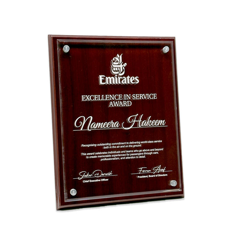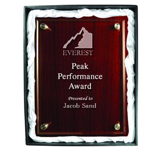 This premium rosewood plaque features a clear glass front panel mounted with gold fittings to create a refined layered look. Presented in a satin lined gift box, this award is perfect for recognising exceptional achievement, leadership, or service. The combination of polished timber and crystal-clear glass delivers a timeless, professional presentation.