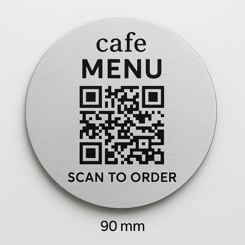 Our brushed metal café and restaurant table menu QR signs bring a premium, contemporary touch to your venue. Crafted from high-quality sublimation metal with a sleek brushed finish, these 90mm discs are designed for durability and style. Using full-colour sublimation printing, each sign delivers crisp, vibrant QR codes and custom branding that won’t fade or peel over time.