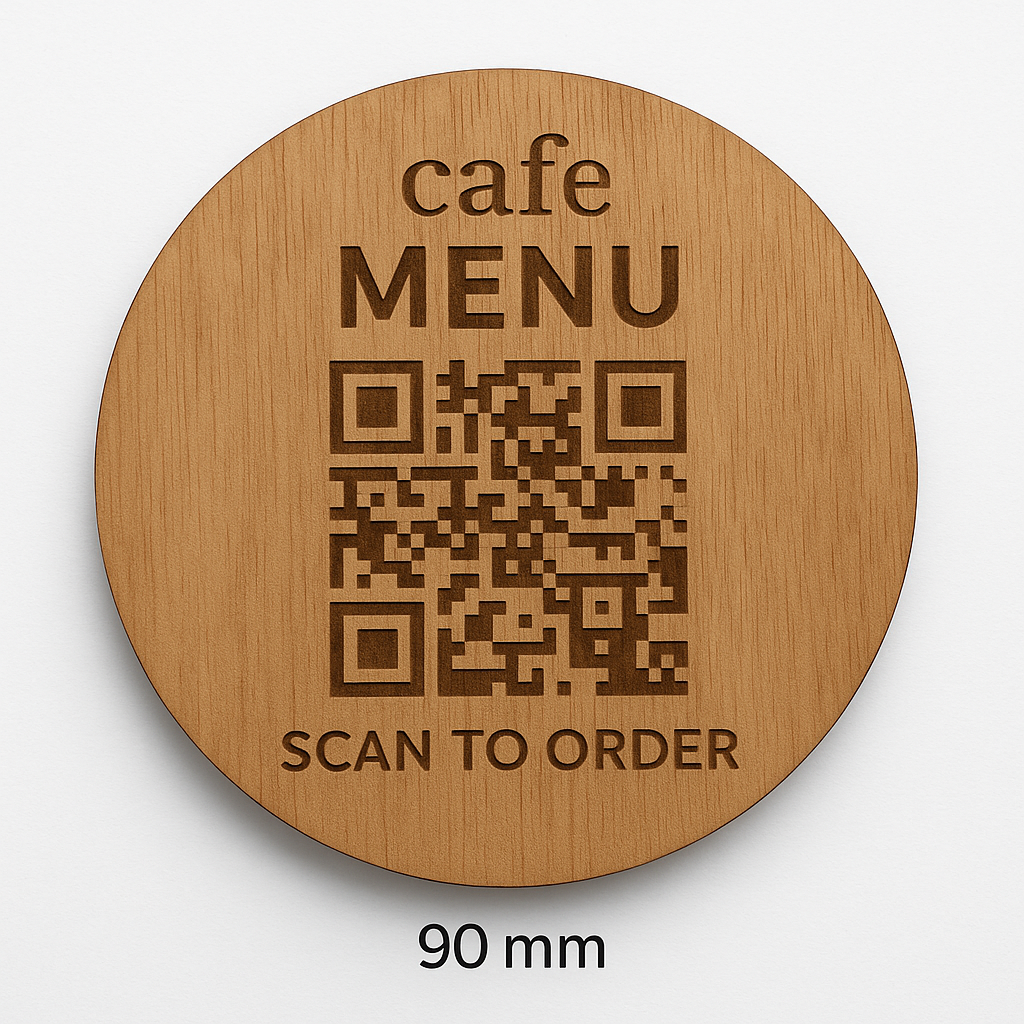 Our wooden veneer café and restaurant table menu QR signs combine natural charm with modern functionality. Crafted from premium timber, each sign is precision laser-engraved with a sharp QR code that links directly to your digital menu. The warm, organic finish of the wood creates a stylish and welcoming aesthetic, making these signs ideal for venues that value both design and practicality.
