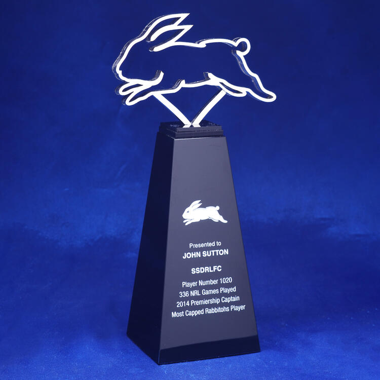 The Rabbitohs Metal Bunny Trophy captures the proud spirit of the South Sydney Rabbitohs through a polished alloy emblem, precision cut and elevated above a sleek black crystal base. This striking award was designed as a one of a kind piece to honour a club legend, combining heritage and craftsmanship in perfect balance.