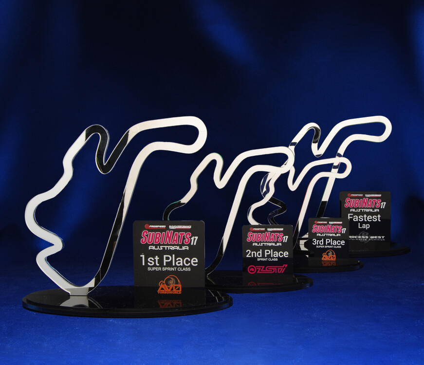 Custom-shaped acrylic race track award featuring a laser-cut racetrack outline mounted on a glossy black base. Printed panel for event branding and winner details. Designed for automotive and racing events.