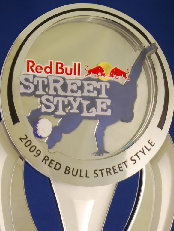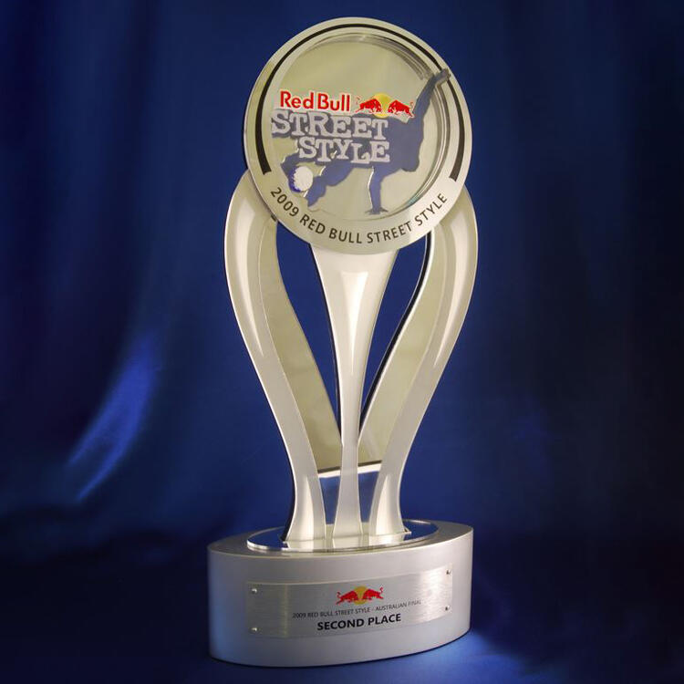 This dynamic custom award was created for Red Bull Street Style, featuring layered acrylic elements in a contemporary lumina style. The sculptural form showcases a frosted and clear acrylic blend with printed logo details, all mounted on a polished base.