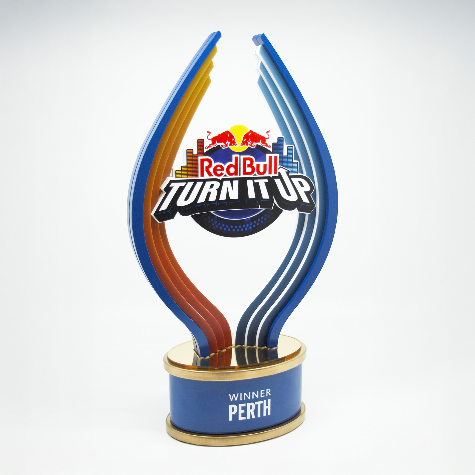 The Red Bull Turn It Up Trophy is a dynamic layered acrylic award crafted to reflect the energy and creativity of the event. Precision-cut acrylic panels form a sculptural flame-style shape, showcasing a vivid gradient of colours and a striking full-colour printed logo.