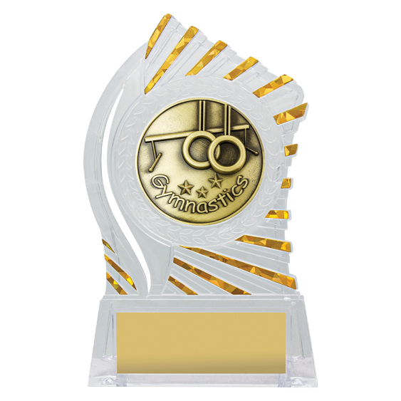 Crafted to honour achievement in gymnastics, this gymnastics trophy features a striking abstract design highlighted by a gold medal motif at its centre. The combination of gold and clear elements, along with detailed representations of gymnastics equipment and stars, creates a refined, celebratory look. The base provides a stable and elegant foundation for this standout award.