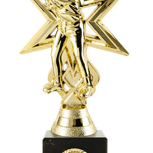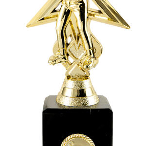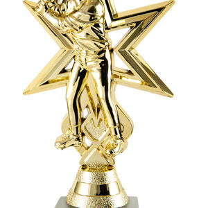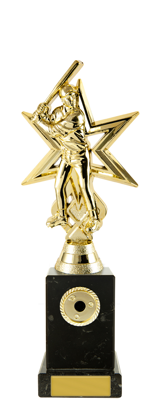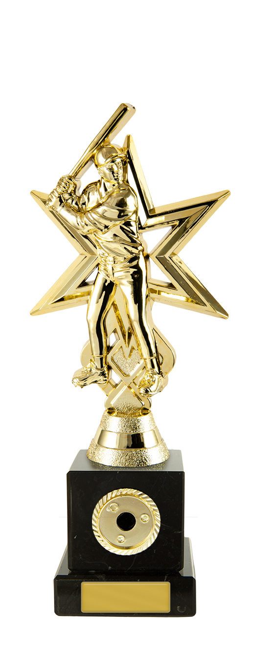 Striking gold plastic figure of a male batter set in front of a bold star backdrop. Mounted on a solid black marble base with gold engraving plate. Ideal for top performer or MVP awards.