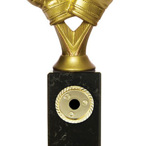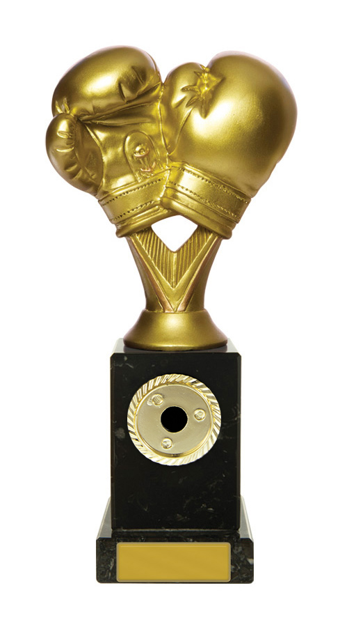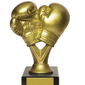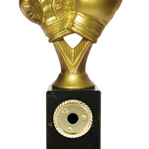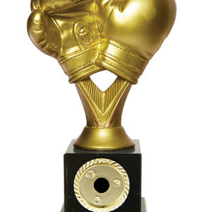 Celebrate achievement in boxing with this distinguished trophy, crafted to recognise dedication and skill in the ring. A striking pair of golden boxing gloves crowns a black base, complemented by a circular emblem and a customisable plaque.