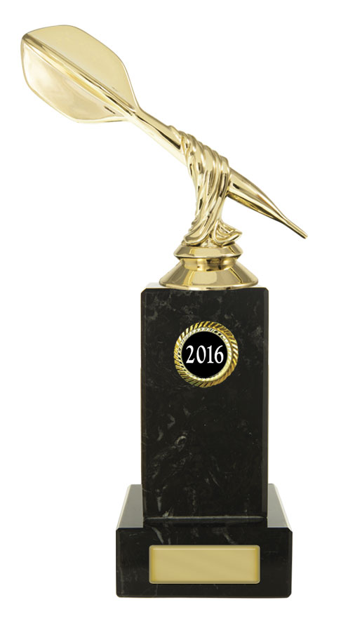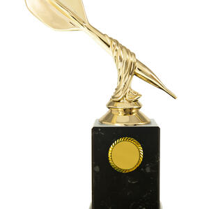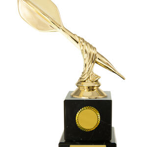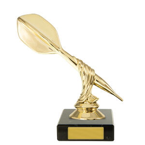 This darts trophy features a gold coloured dart figure set atop a black base, accented by refined gold details. The twisted design adds a modern touch. Ideal for recognising darts achievement, this award offers a distinguished and professional presentation for any event.