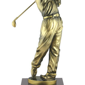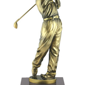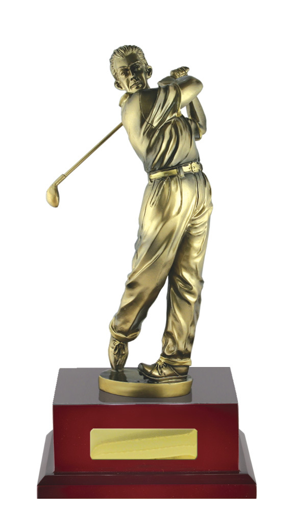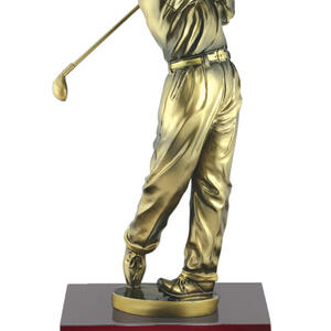 A timeless golf trophy depicting a male golfer in full swing. Finished in antique gold and mounted on a polished timber-look base, its a great option for mens competition winners, longest drive or best score awards.