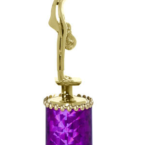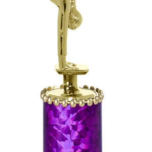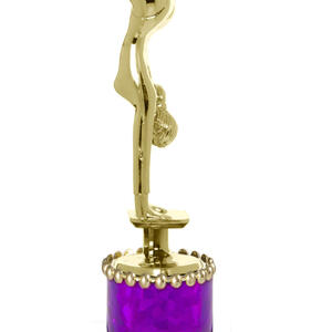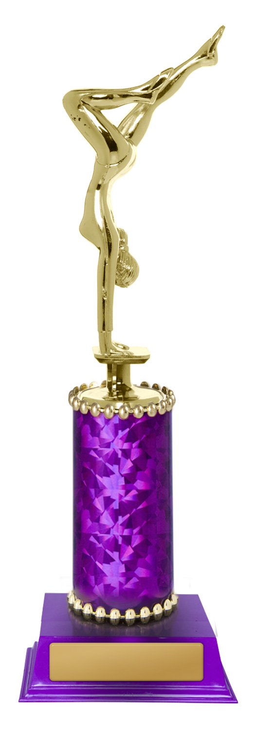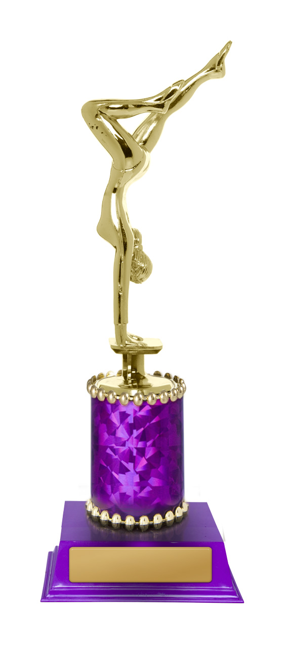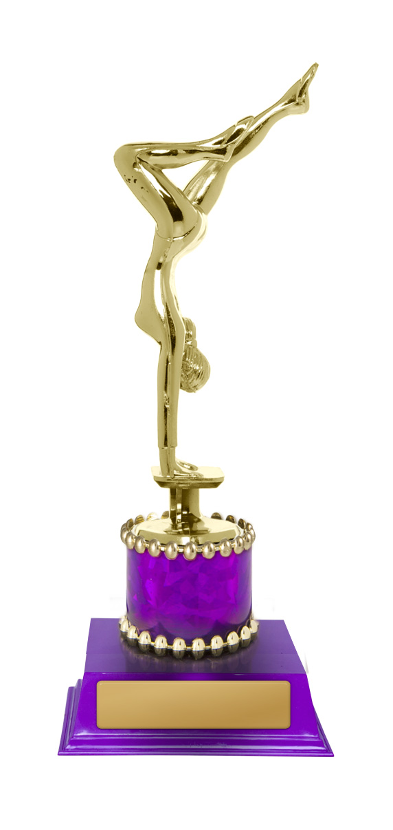 Celebrate dedication and skill with this elegant sports award trophy, designed to honour outstanding performances in gymnastics. Featuring a golden female gymnast held in a striking handstand, this trophy is set atop a vivid purple cylindrical base with decorative trim for a memorable display. Crafted from plastic, with space for personalised engraving. An ideal addition to gymnastics trophies for competitions and events.