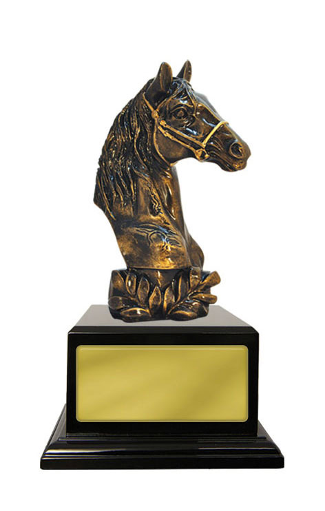 This horse trophy is crafted for equestrian awards, featuring a sculpted horse head with intricate detailing that captures the spirit and strength of the sport. The abstract design, finished in gold and bronze, stands elegantly atop a durable black base. A gold engraving plaque is included for customisation, offering a refined way to honour achievement in equestrian pursuits.