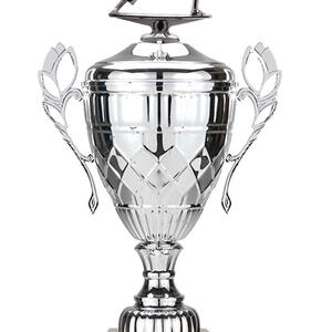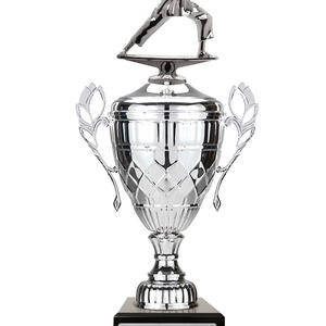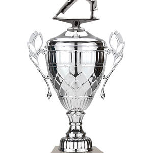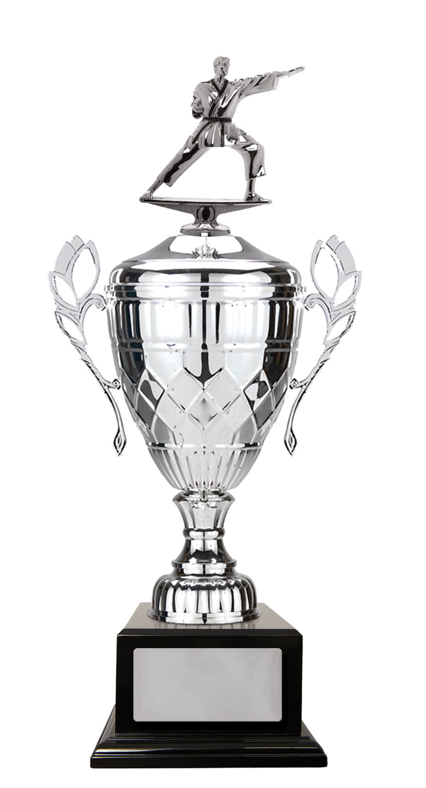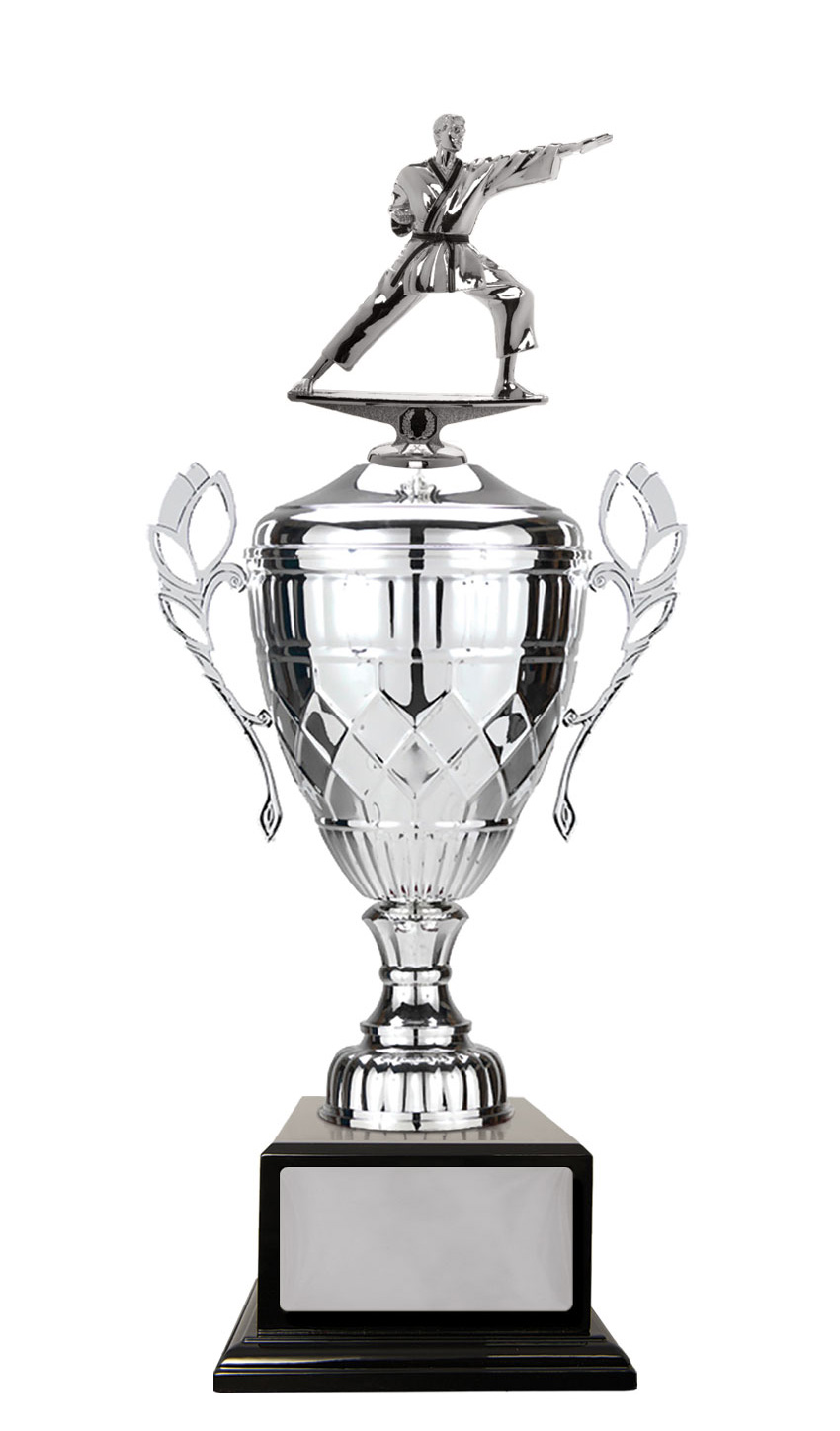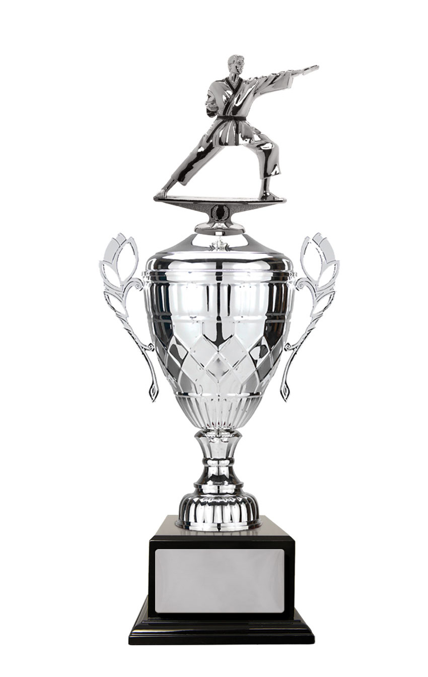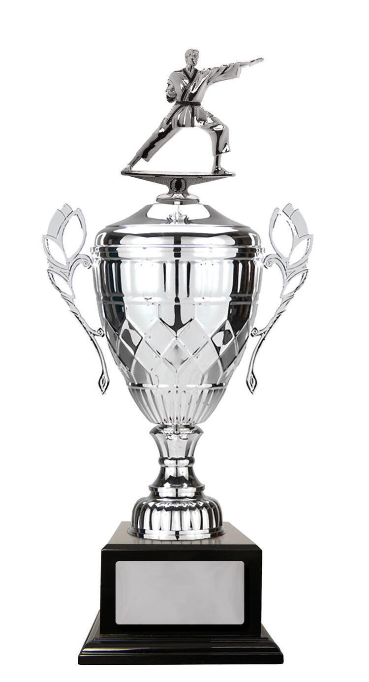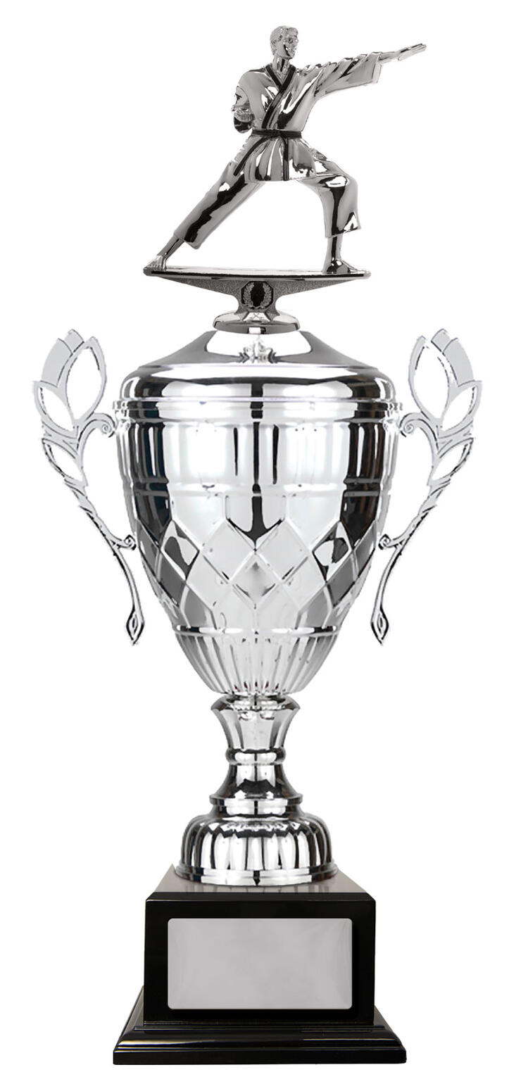 This martial arts trophy stands out with its polished silver metal cup, detailed side handles, and a dynamic martial arts figurine in a powerful pose. It features a sturdy plastic stem and a solid base for lasting presence. The blank plaque offers the option for personalisation, making it ideal for honouring commitment and skill in martial arts achievements.