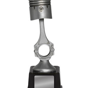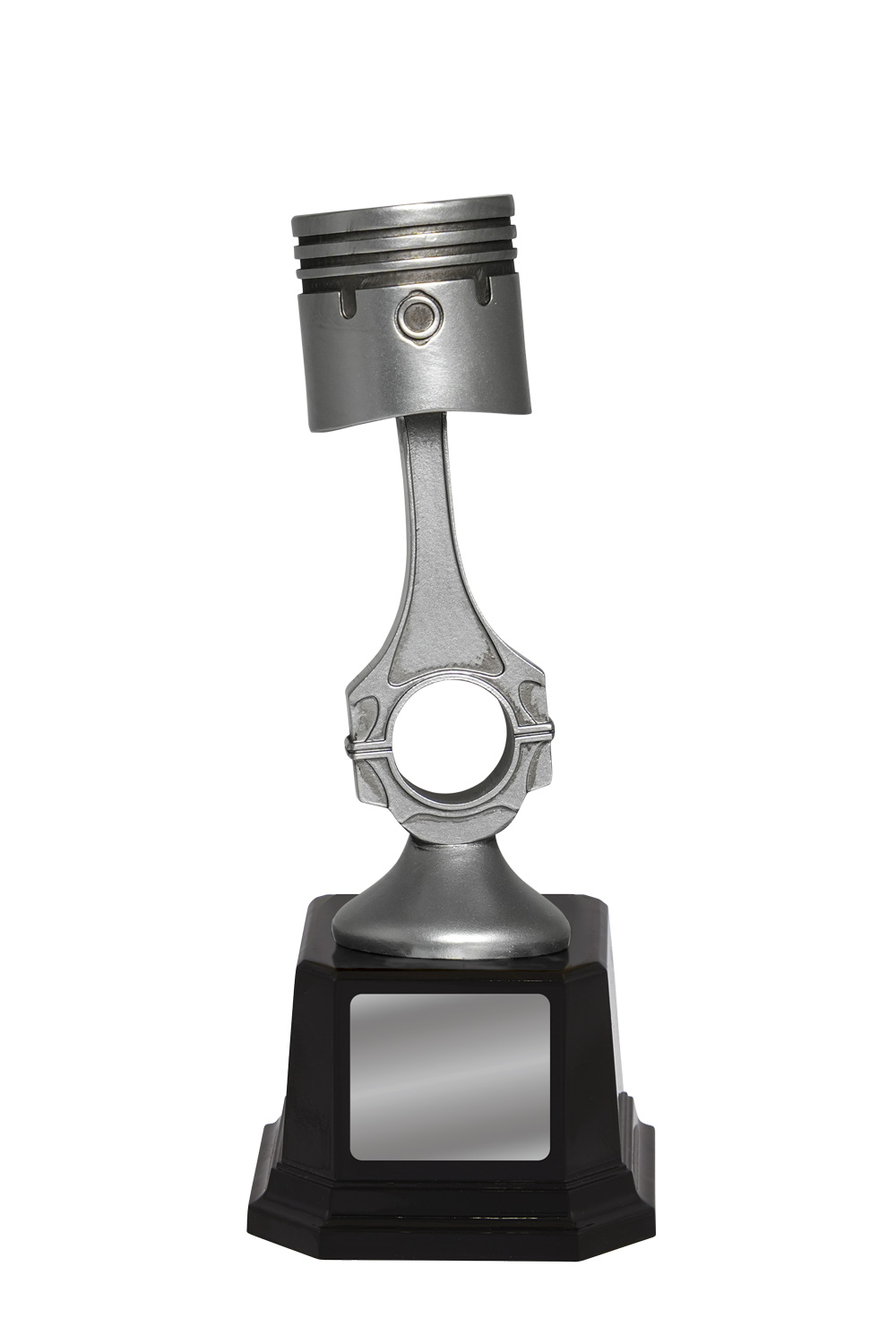 This motorsport trophy features a detailed silver piston and connecting rod, elegantly mounted on a black base. The design captures the spirit and mechanical heritage of motor racing, making it a fitting tribute to outstanding automotive achievement.