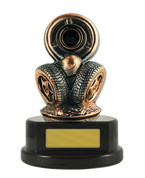 This motorsport trophy combines a bronze and black finish with a design inspired by tyres and a steering wheel, capturing the essence of competitive motor racing. Crafted from resin, it offers a professional and elegant presentation. Each trophy includes a customisable plate, making it a versatile choice for motorsport trophies at events and car shows.