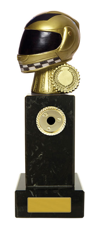 This sports award trophy is crafted for distinction in motor sports. Featuring a detailed 3D golden helmet with a checkered pattern and laurel wreath, it stands out on a sleek black base. The gold and black colour scheme, durable construction, and included customisation option make it a memorable and professional motor sports trophy for any achievement.