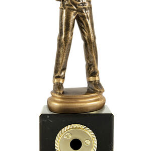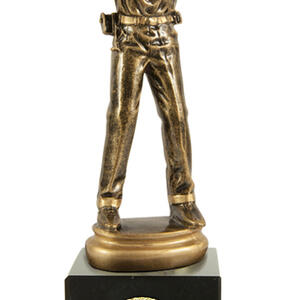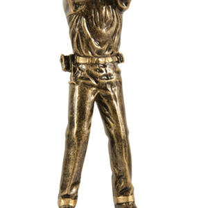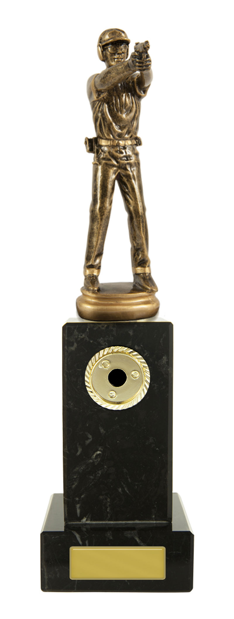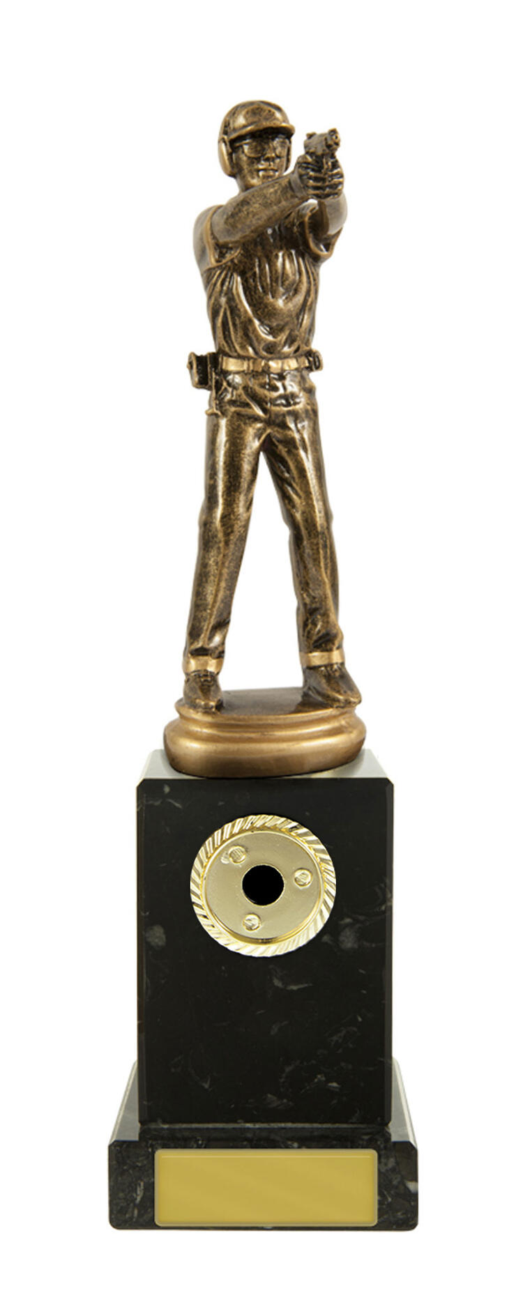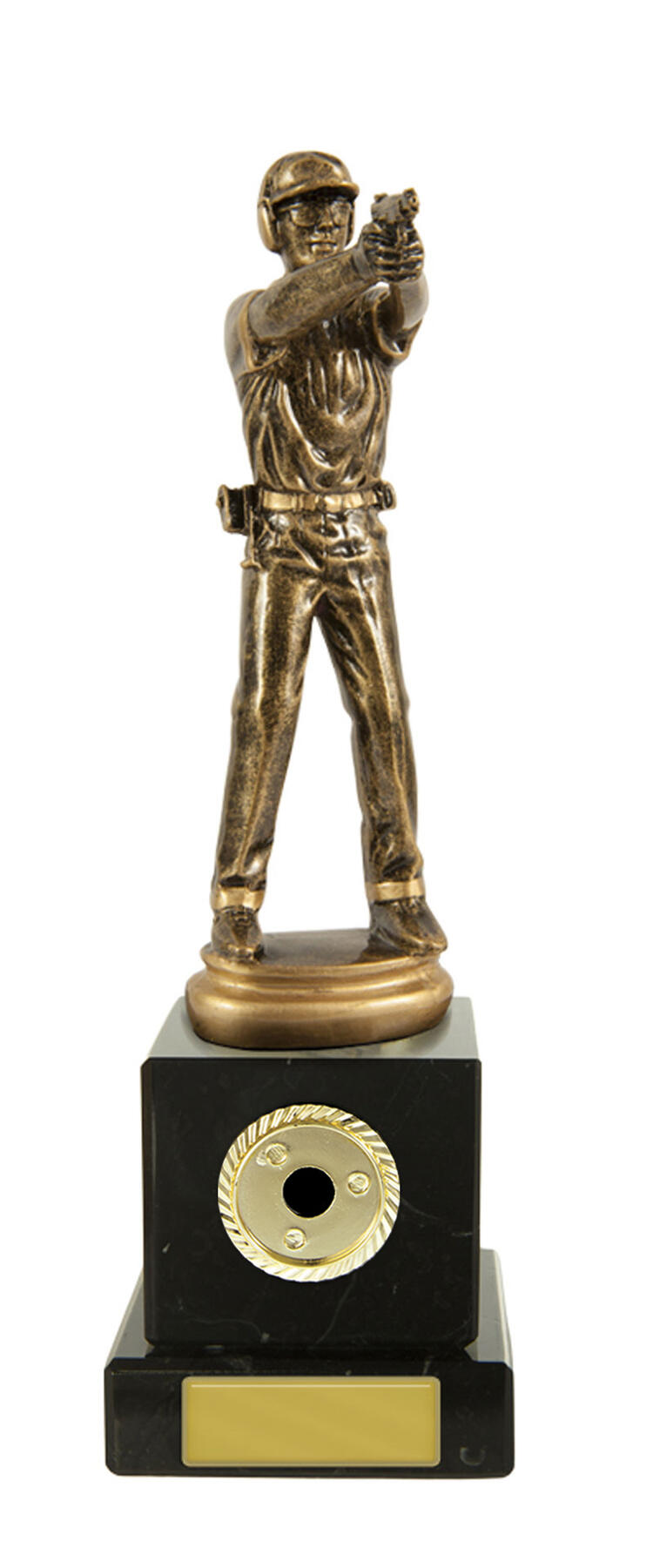 Celebrate precision and accomplishment with this pistol shooting trophy, expertly crafted for shooting sports awards. A contoured figure in antique gold, depicting a marksman in action, is mounted on a solid black base and complemented by a gold engraving plate.