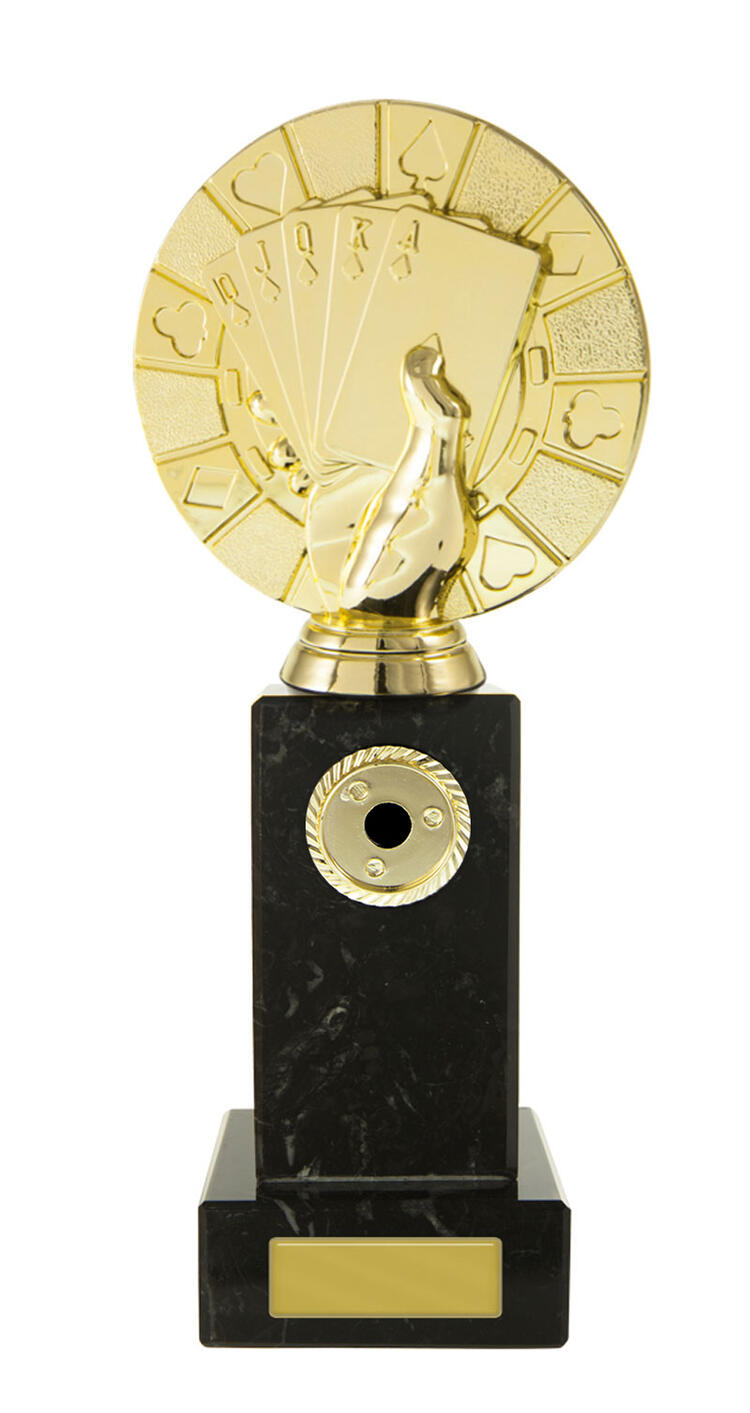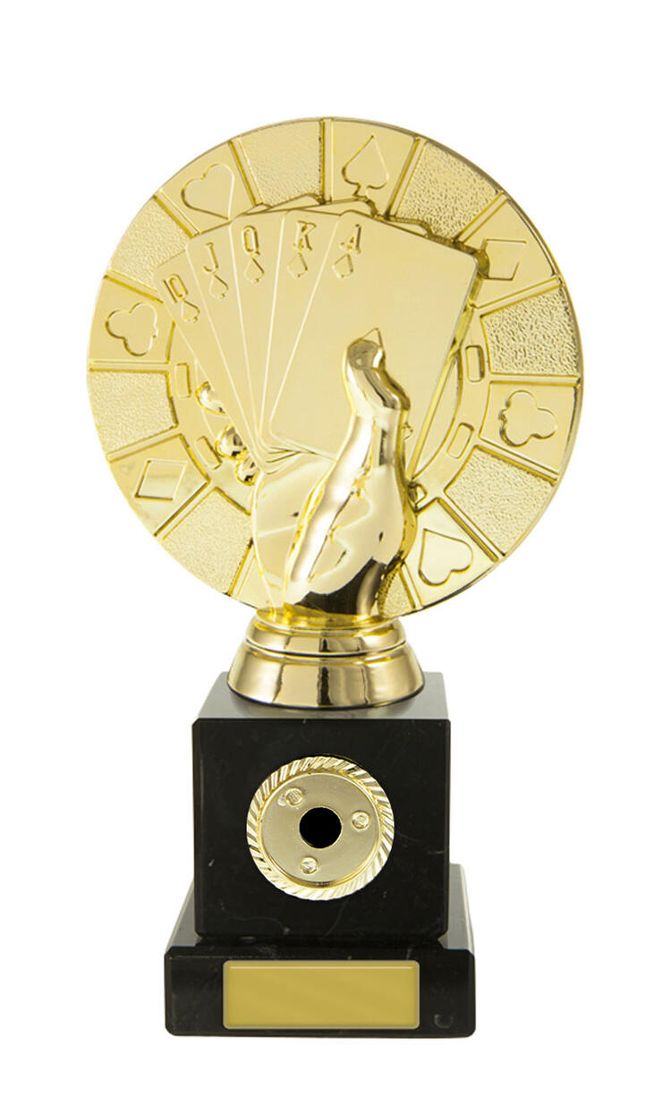Distinguished by its contemporary design, this cards trophy features a striking hand holding a royal flush atop a rectangular base. The elegant gold and black finish, paired with durable marble and plastic construction, makes it a standout poker award for tournaments and casino events.